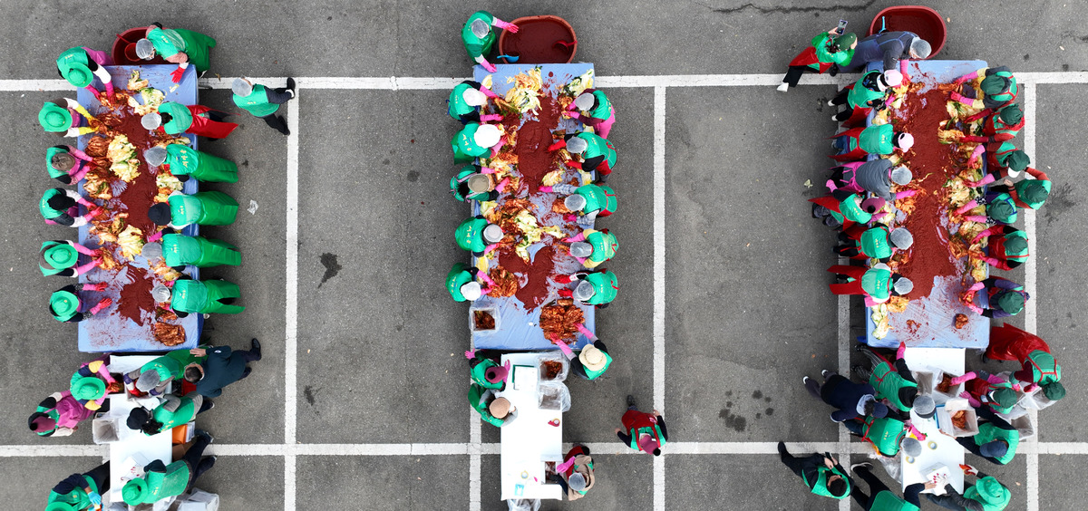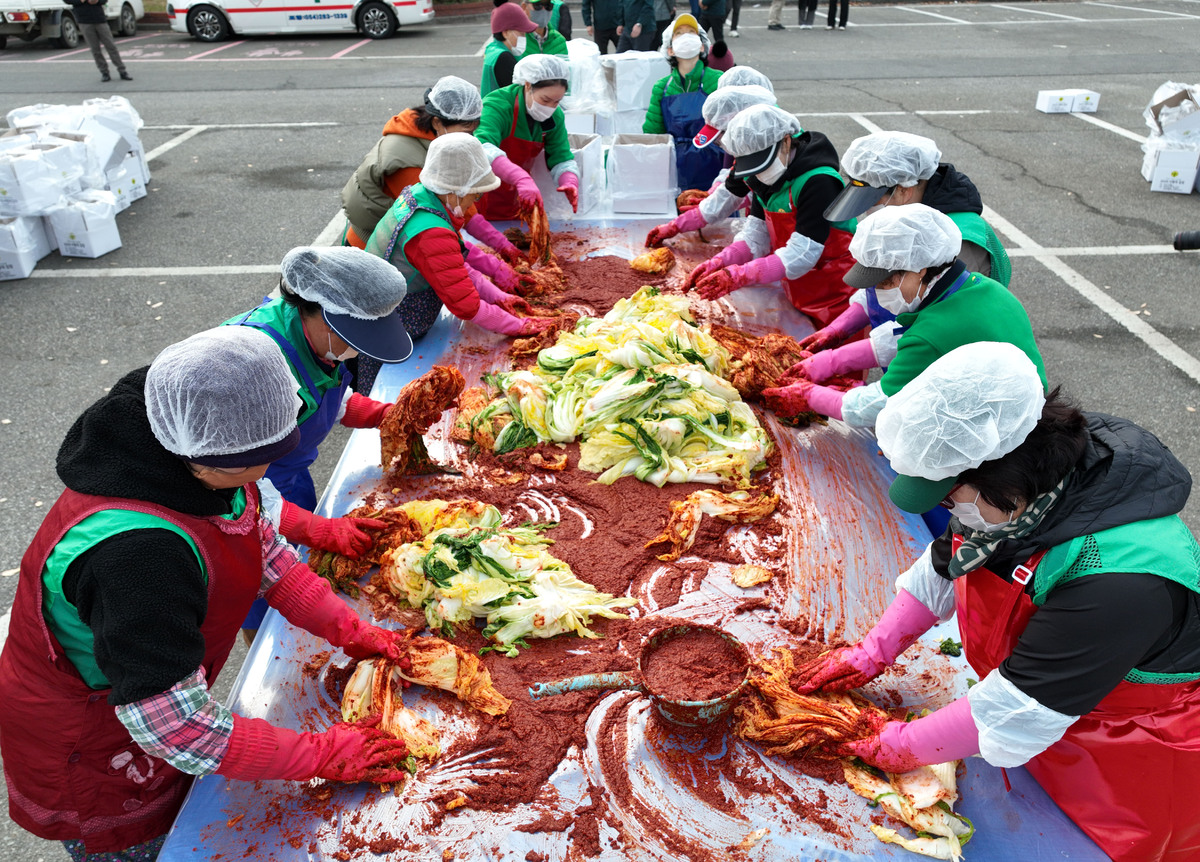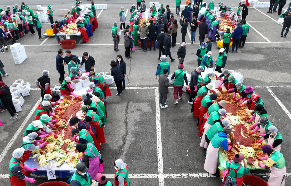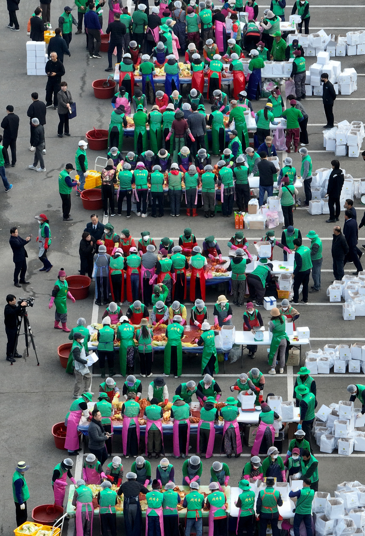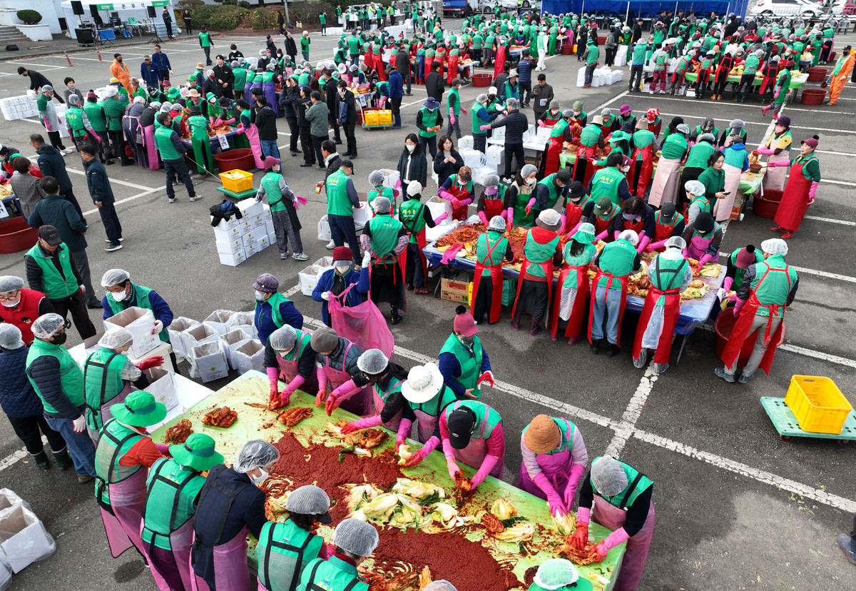 24일 포항 종합운동장 주차장에서 포항시 새마을회 회원과 포항시청, 세무서 직원 등 1,500여 명이 사랑의 김장 담그기&나눔 행사를 하고 있다. 이날 담근 1만 포기의 김장 김치는 취약 계층에 전달된다. /이용선기자 photokid@kbmaeil.com