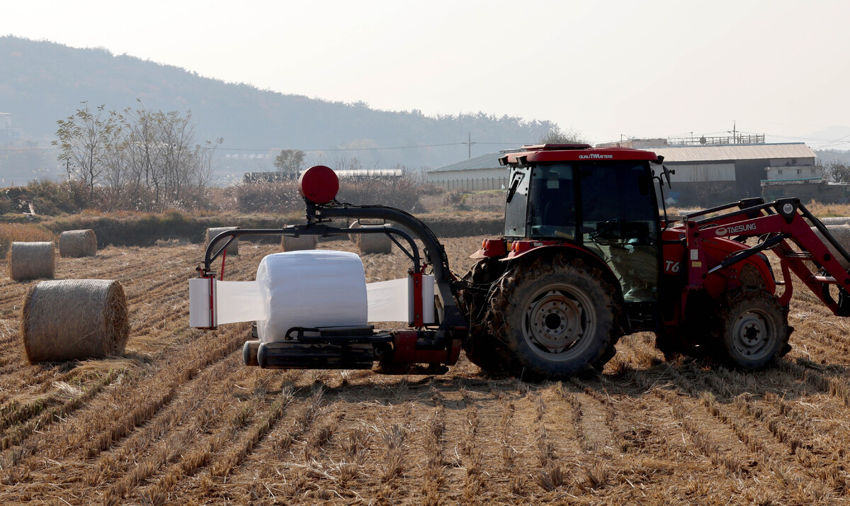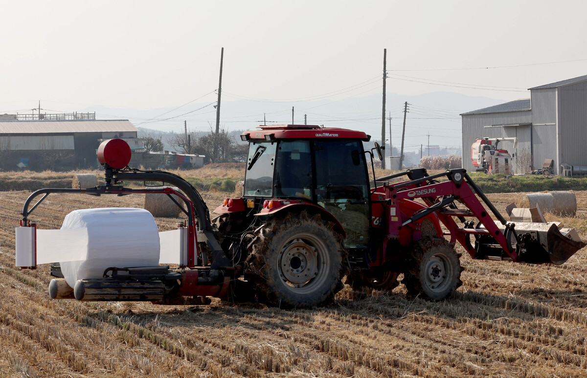 26일 오전 추수가 끝난 경주시 천북면 들녘에서 볏짚을 모아 사료로 사용할 곤포 사일리지를 만들고 있다. /이용선기자 photokid@kbmaeil.com