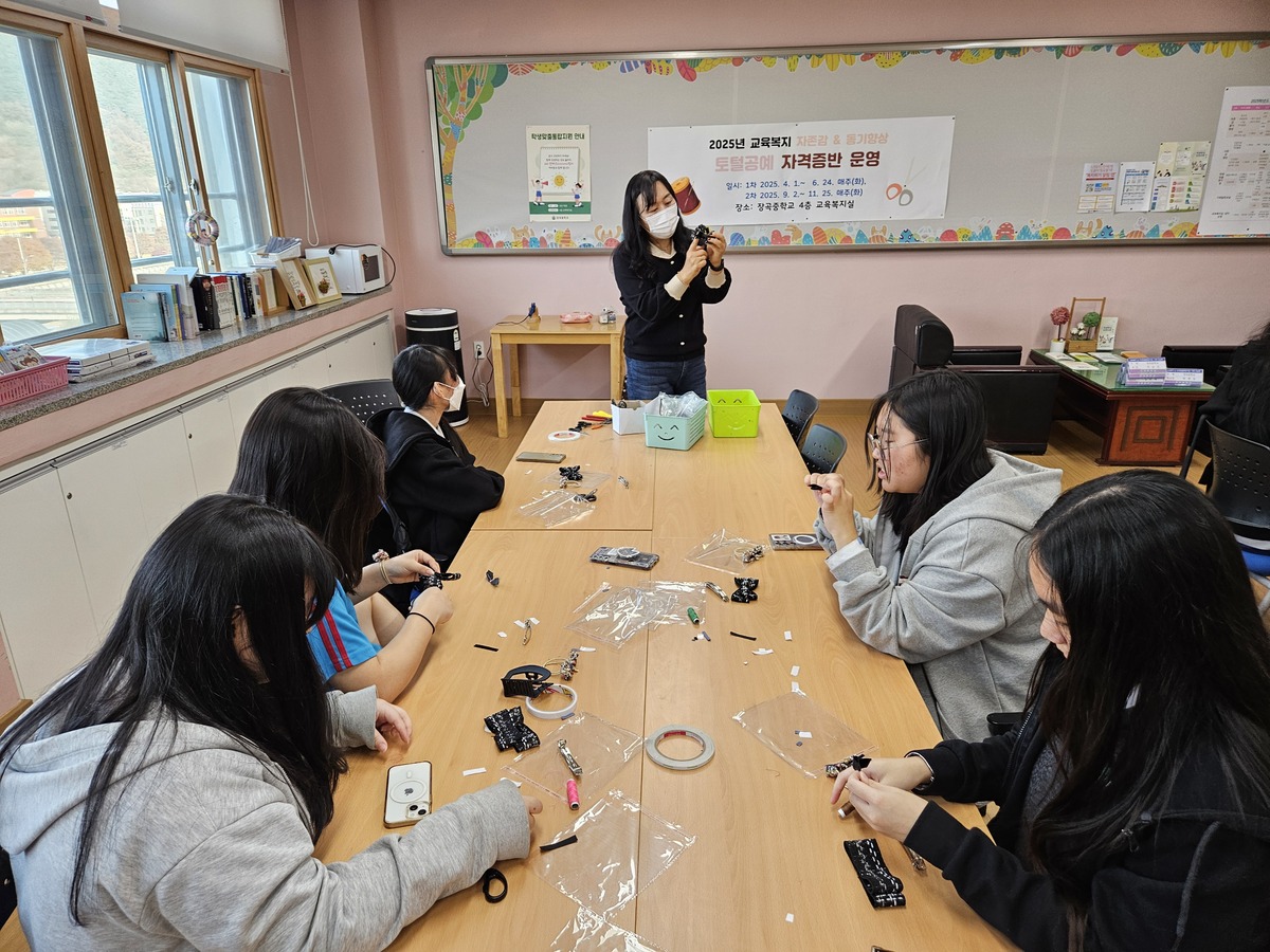 칠곡군 장곡중학교(교장 박현동)는 9월 2일부터 11월 25일까지 총 10회에 걸쳐 2·3학년 학생 12명을 대상으로 ‘청소년 토털공예 자격증반 1·2급 과정’을 진행해 참여 학생 전원이 자격증을 취득하는 큰 성과를 이뤘다.