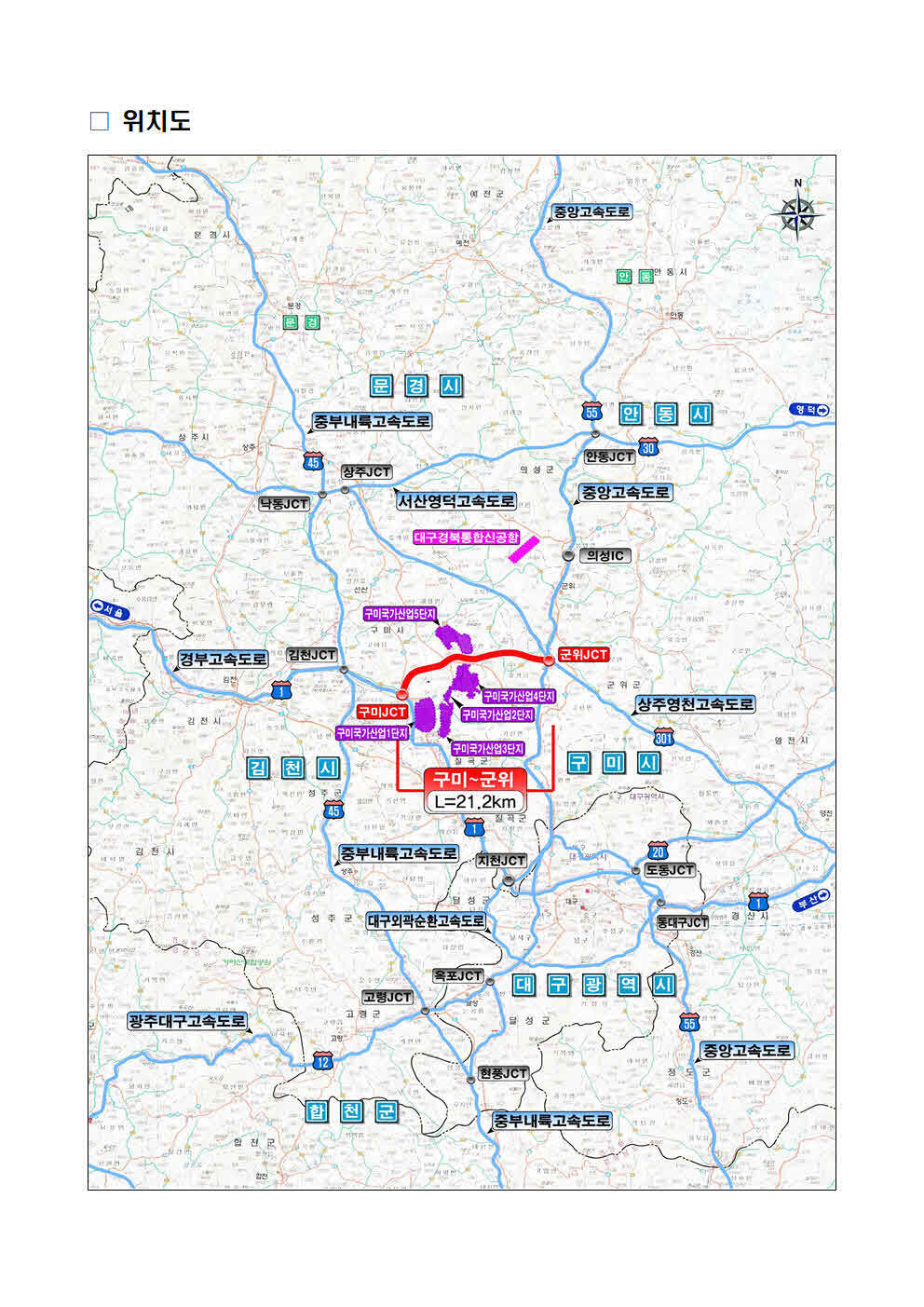 구미~군위 고속도로는 구미에서 군위군 효령면(중앙고속도로)까지 총 21.2km 구간을 4차로로 신설하는 사업으로, 사업비는 약 1조 5627억 원 규모다. 이는 1970년 경부고속도로 이후 55년 만에 구미를 통과하여 동서를 잇는 첫 고속도로라는 점에서 의미가 크다.