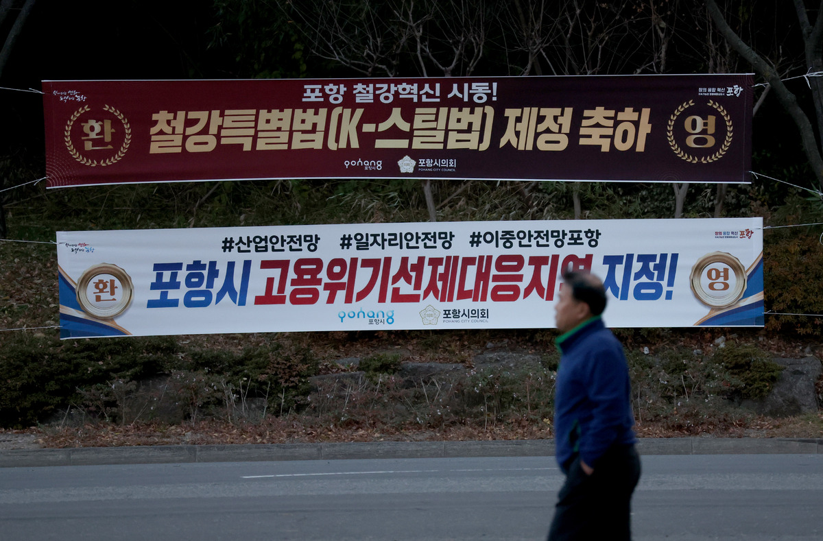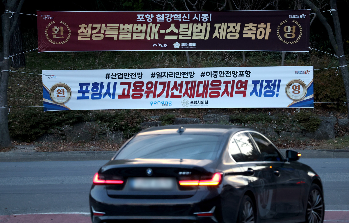 위기에 처한 국내 철강산업을 지원할 근거를 담은 ‘K-스틸법’이 27일 국회 본회의를 통과하면서 침체 위기에 빠진 포항시의 경제도 숨통이 트일 수 있을지 관심이 쏠리고 있다. 포항시청 삼거리에 K-스틸법 국회 본회의 통과를 축하하는 현수막이 걸려 있다. /이용선기자 photokid@kbmaeil.com