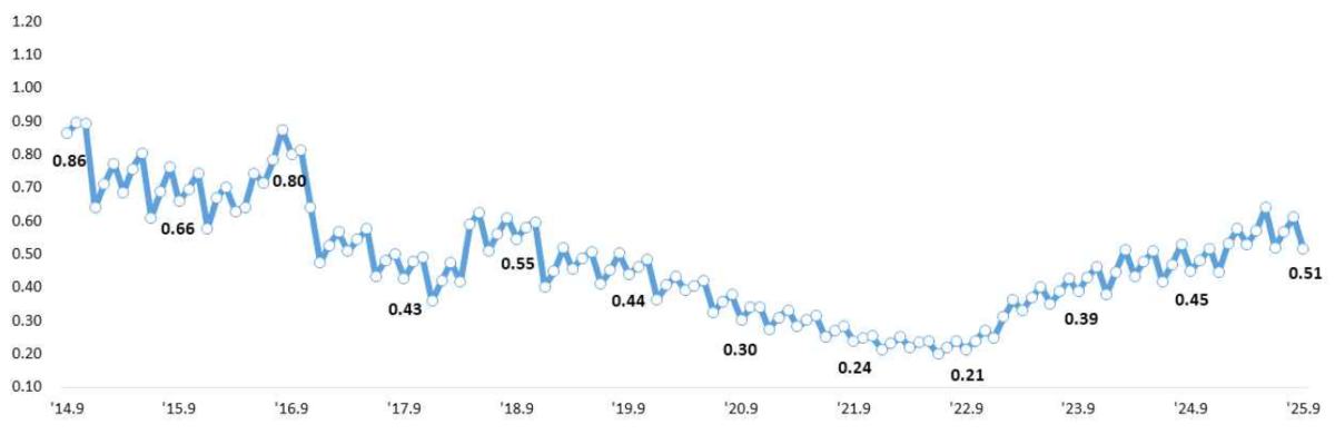금융감독원이 27일 발표한 ‘2025년 9월말 국내은행 원화대출 연체율(잠정)’에 따르면 연체율은 0.51%로 전월 말(0.61%) 대비 0.10%포인트 하락했다. 다만 전년 동월말(0.45%)과 비교하면 0.06%포인트 상승한 수준이다.