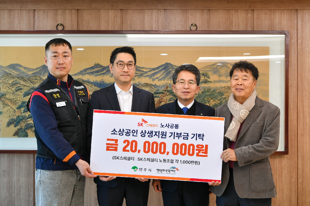 영주시와 SK스페셜티 노사가 지역사회 상생을 위해 총 2000만원을 기부하는 소상공인 상생지원 기부금 전달식을 가졌다.
