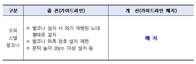 그러나 시는 해당 규제가 오피스텔 설계의 유연성을 과도하게 제한하고, 고층 건축물에서의 추락사고 위험 증가, 강우·강설 시 비산먼지·빗물 유입 등 거주자 불편 요인이 발생한다는 지적을 반영해 기준 폐지를 결정했다.