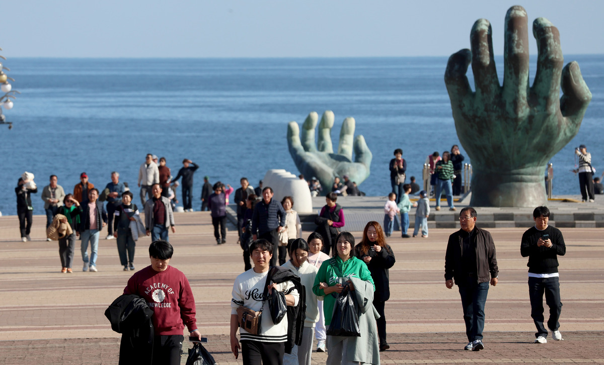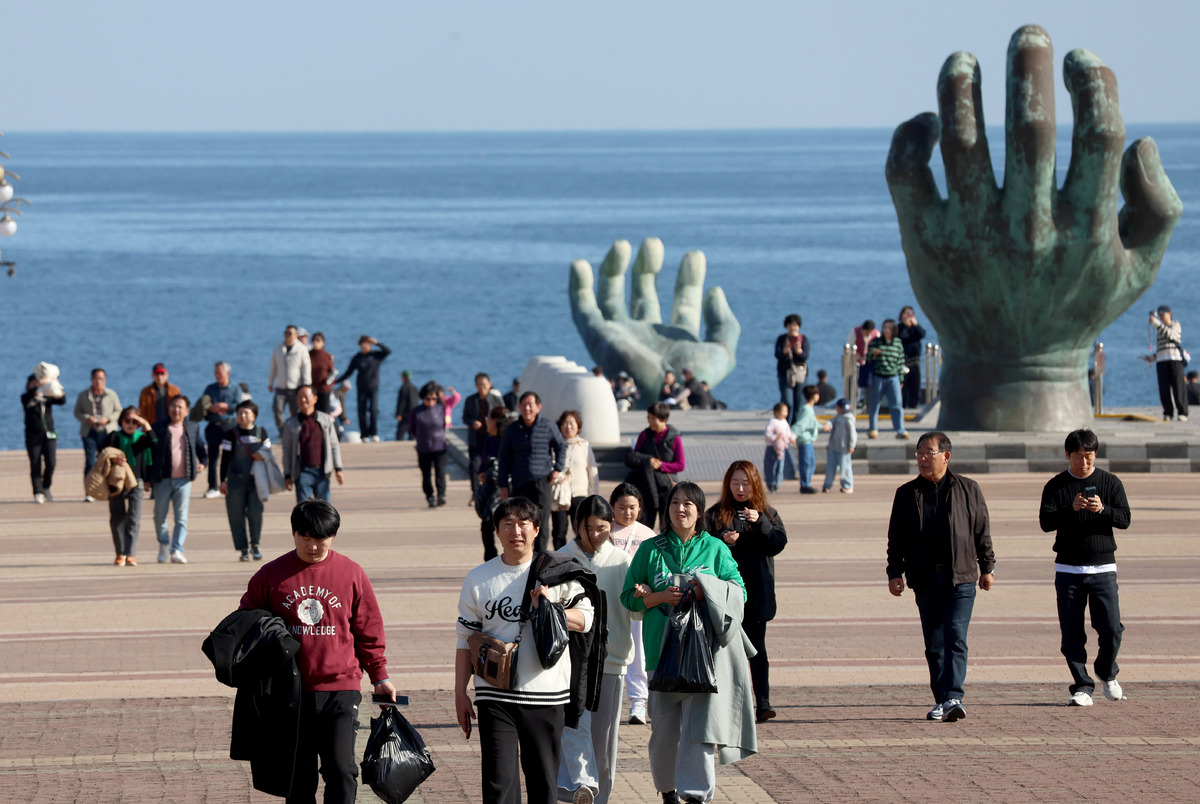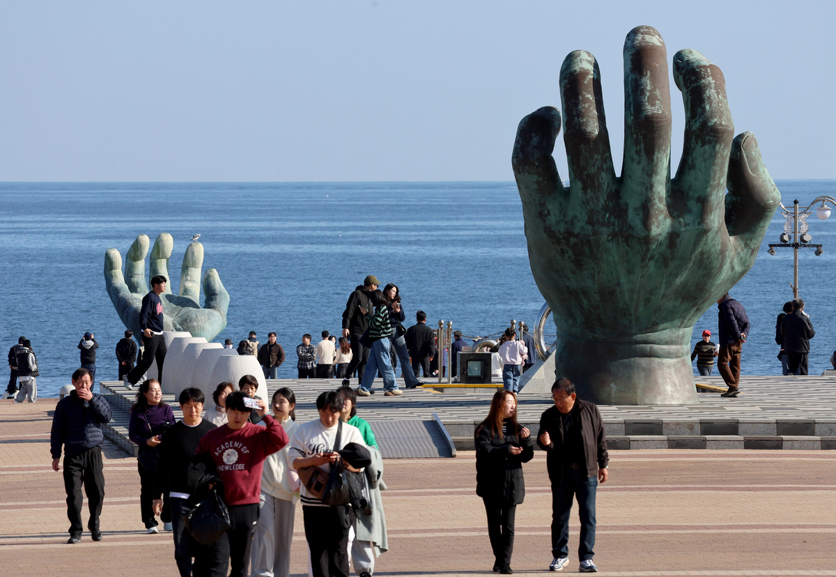 포항 지역 낮 최고 기온이 섭씨 20.2도를 기록하며 포근한 늦가을 날씨를 보인 30일 남구 호미곶면 해맞이광장에서 두툼한 옷을 벗어든 관광객들이 산책을 즐기고 있다. /이용선기자 photokid@kbmaeil.com