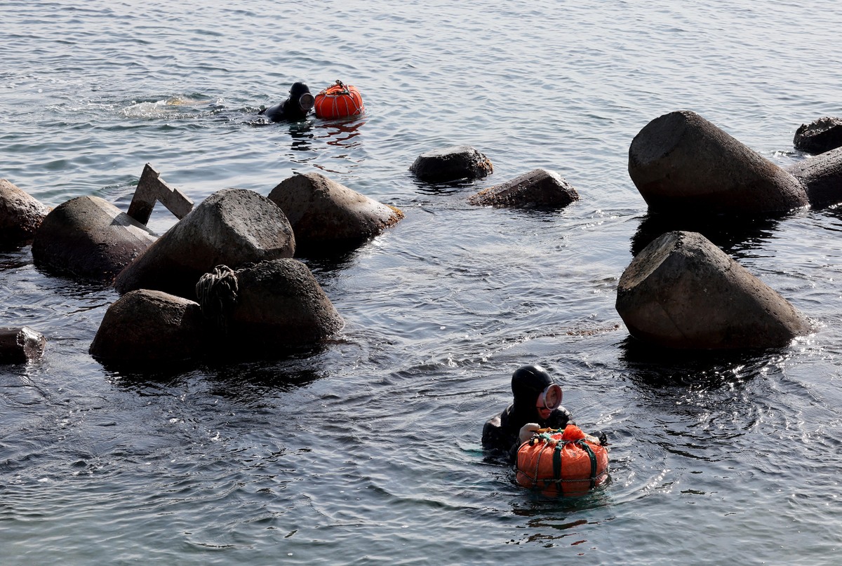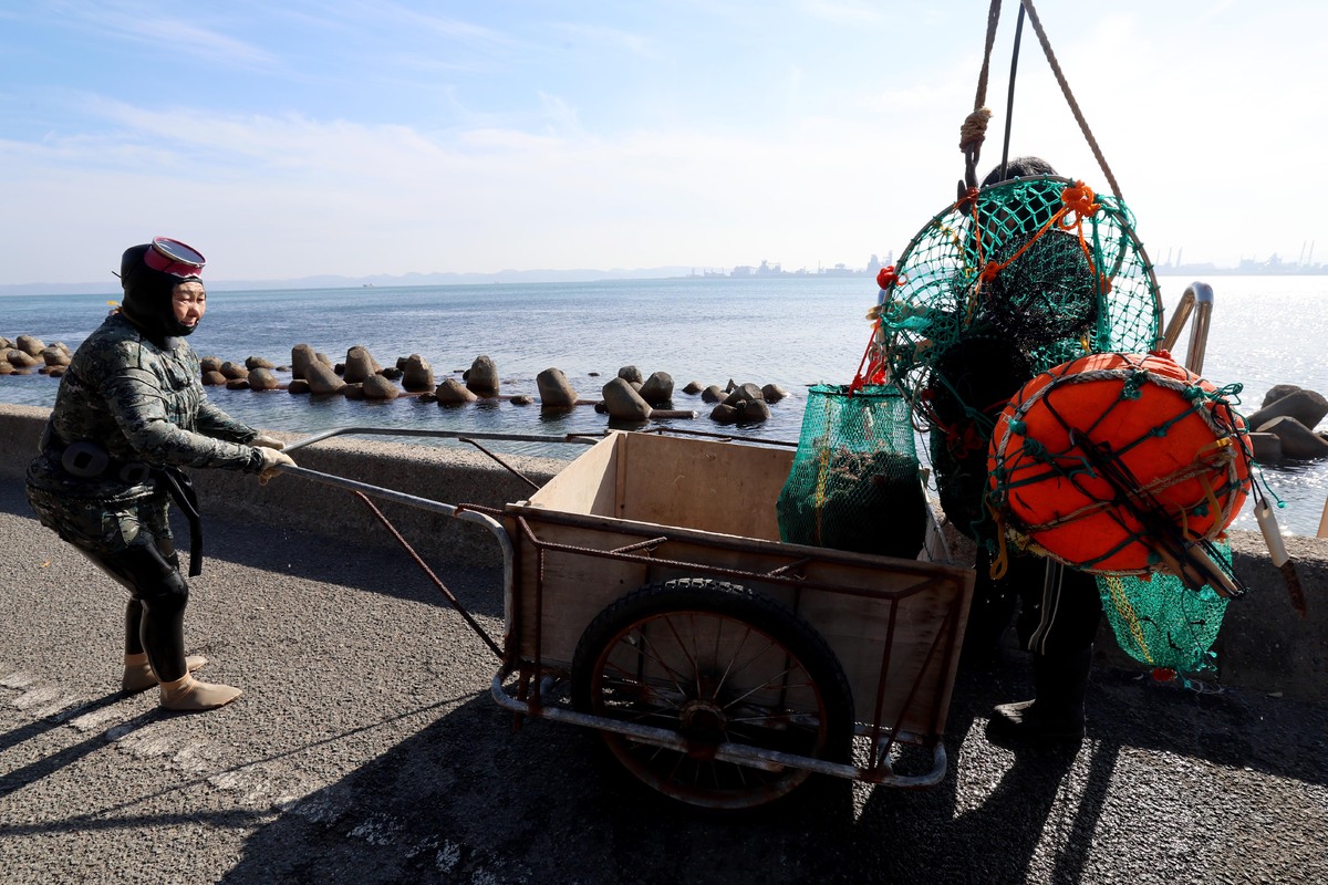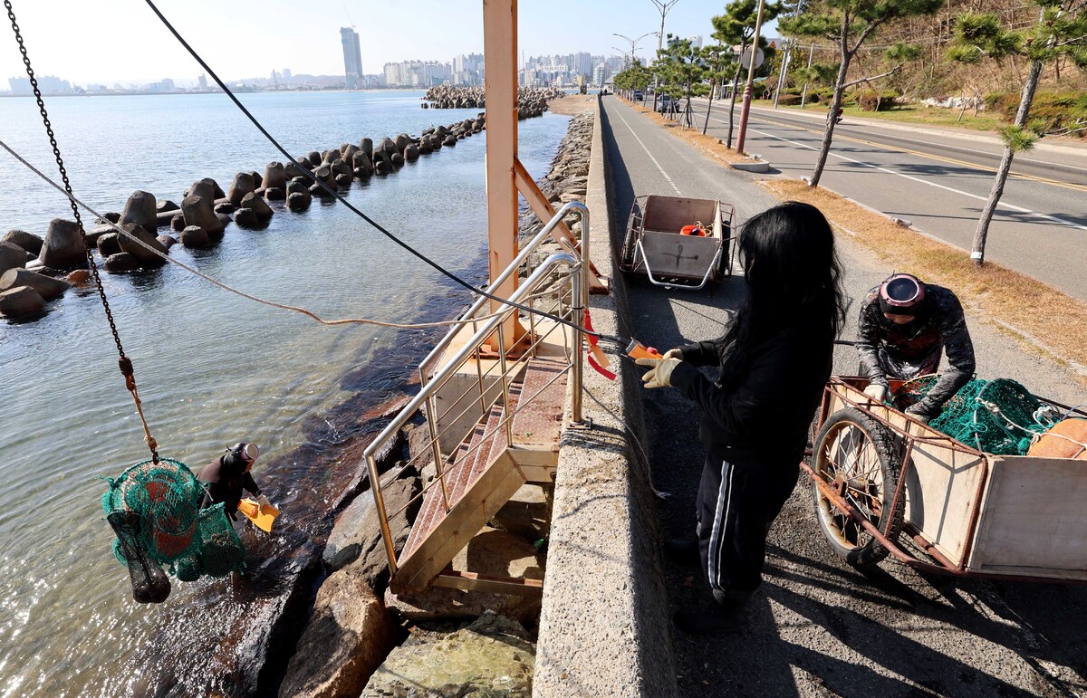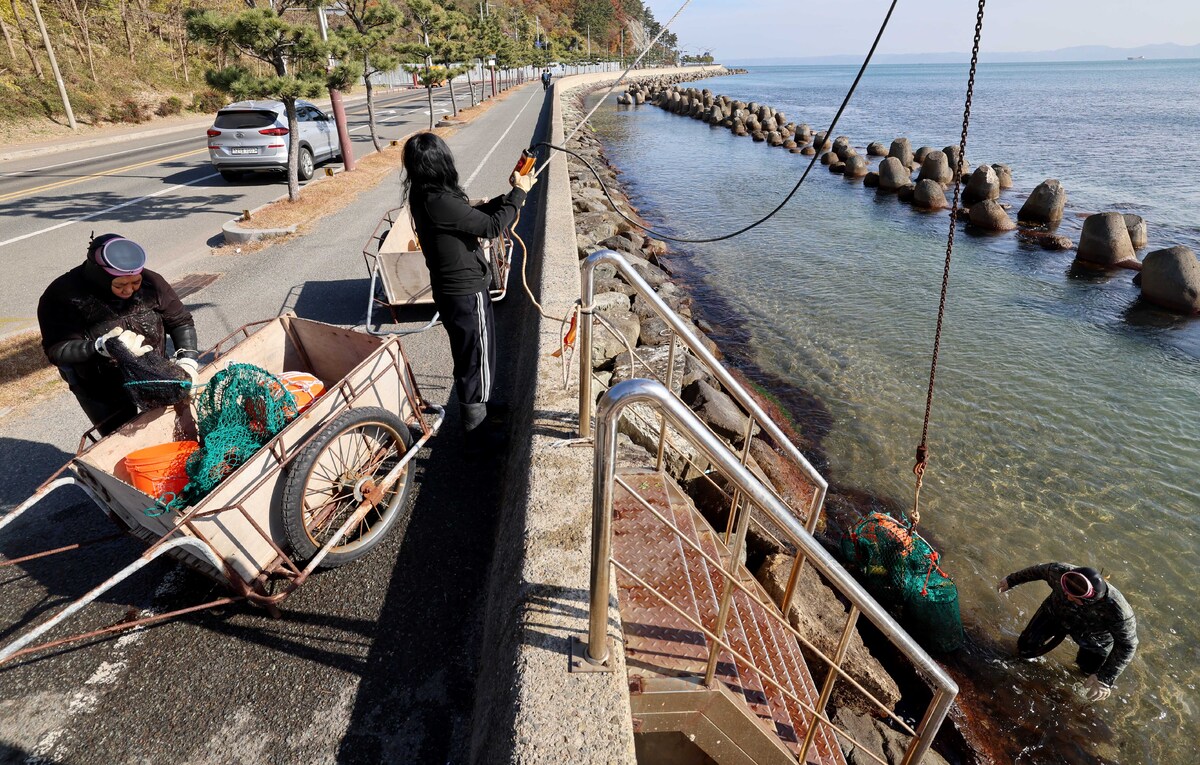1일 오전 해녀들이 포항시 북구 환여동 해안에서 채취한 해삼과 말똥성게를 뭍으로 옮기고 있다. /이용선기자 photokid@kbmaeil.com