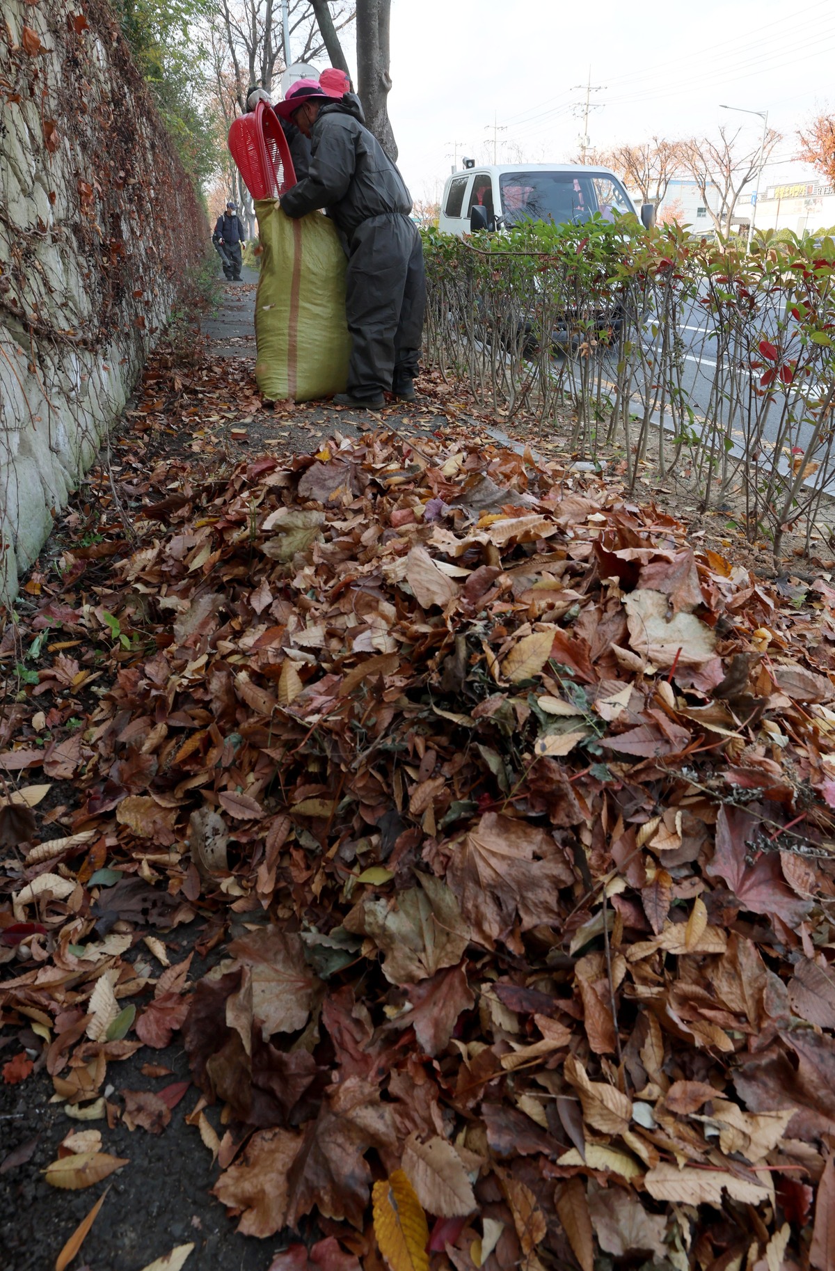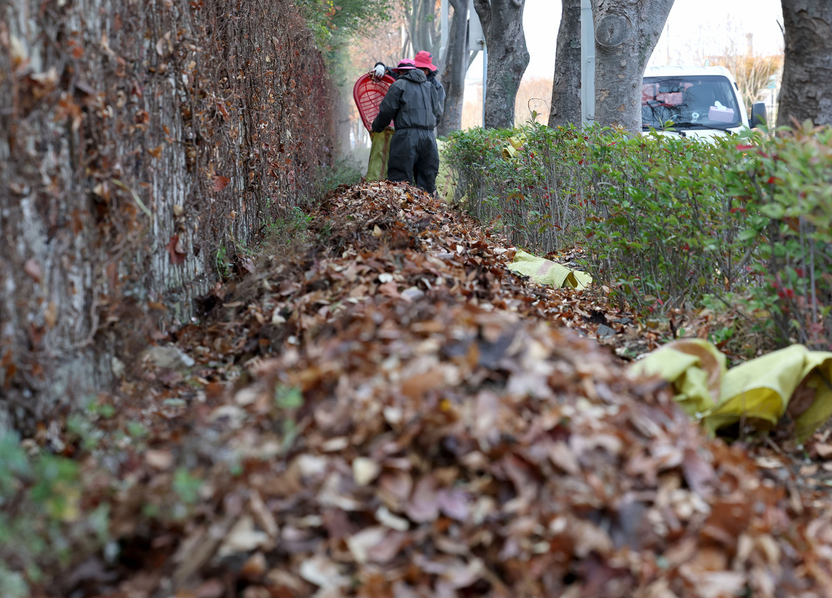 1일 오후 포항시 관계자들이 남구 청림동 인도에 수북이 쌓인 낙엽을 치우고 있다. 수거한 낙엽은 퇴비로 활용한다. /이용선기자 photokid@kbmaeil.com