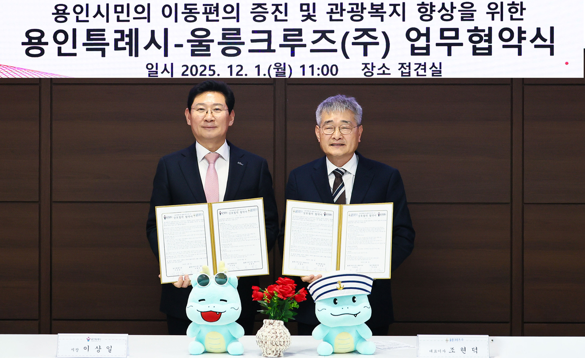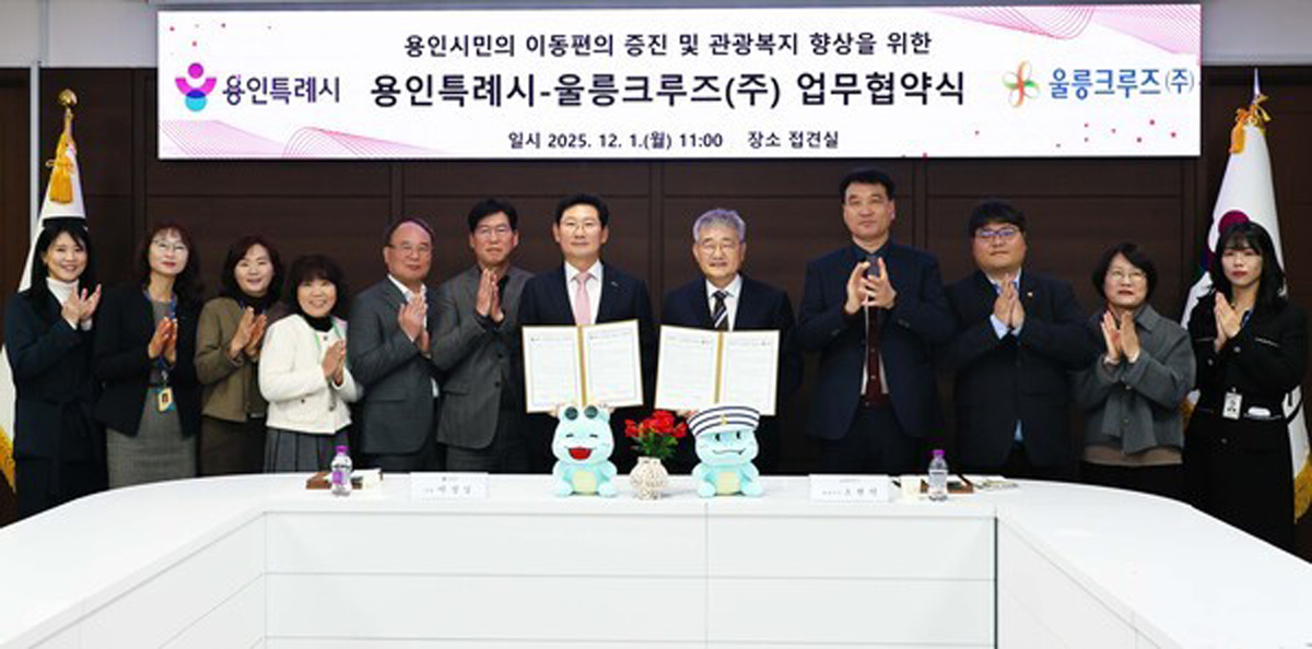 용인특례시는 1일 시청 접견실에서 이런 내용의 업무협약을 울릉크루즈와 체결했다. 시민들의 울릉 나들이 교통비 부담을 낮추기 위한 지원책이어서 향후 양지역 간 교류 폭 확대에 기여할 전망이다. 앞서 지난 9월 울릉군과 용인시는 자매결연을 체결했었다.