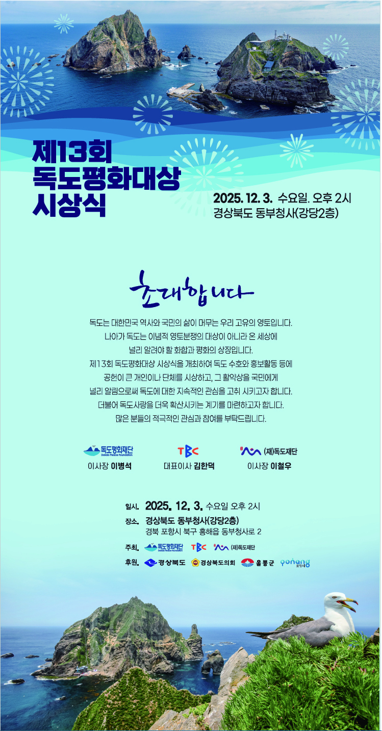 독도 수호와 홍보에 기여한 개인과 단체를 격려하고, 국민들에게 독도의 역사적·문화적 가치를 널리 알리기 위한 ‘제13회 독도평화대상 시상식’이 3일 경북 동부청사에서 개최된다.