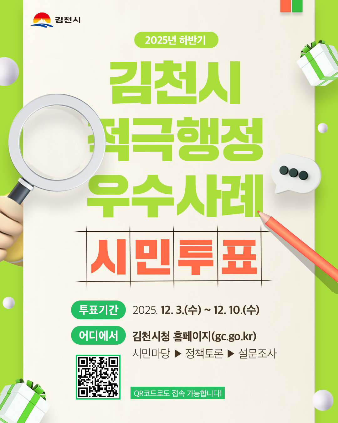 배낙호 김천시장은 “진정한 적극행정 우수사례를 발굴하기 위해서는 행정 서비스를 직접 경험하는 시민 여러분의 생생한 목소리가 무엇보다 중요하다”며, “지난 한 해 동안 김천시 공직자들이 시민을 위해 추진한 다양한 사업 중 가장 우수하다고 생각되는 사례에 소중한 한 표를 행사해 주시기를 당부드린다”고 전했다.