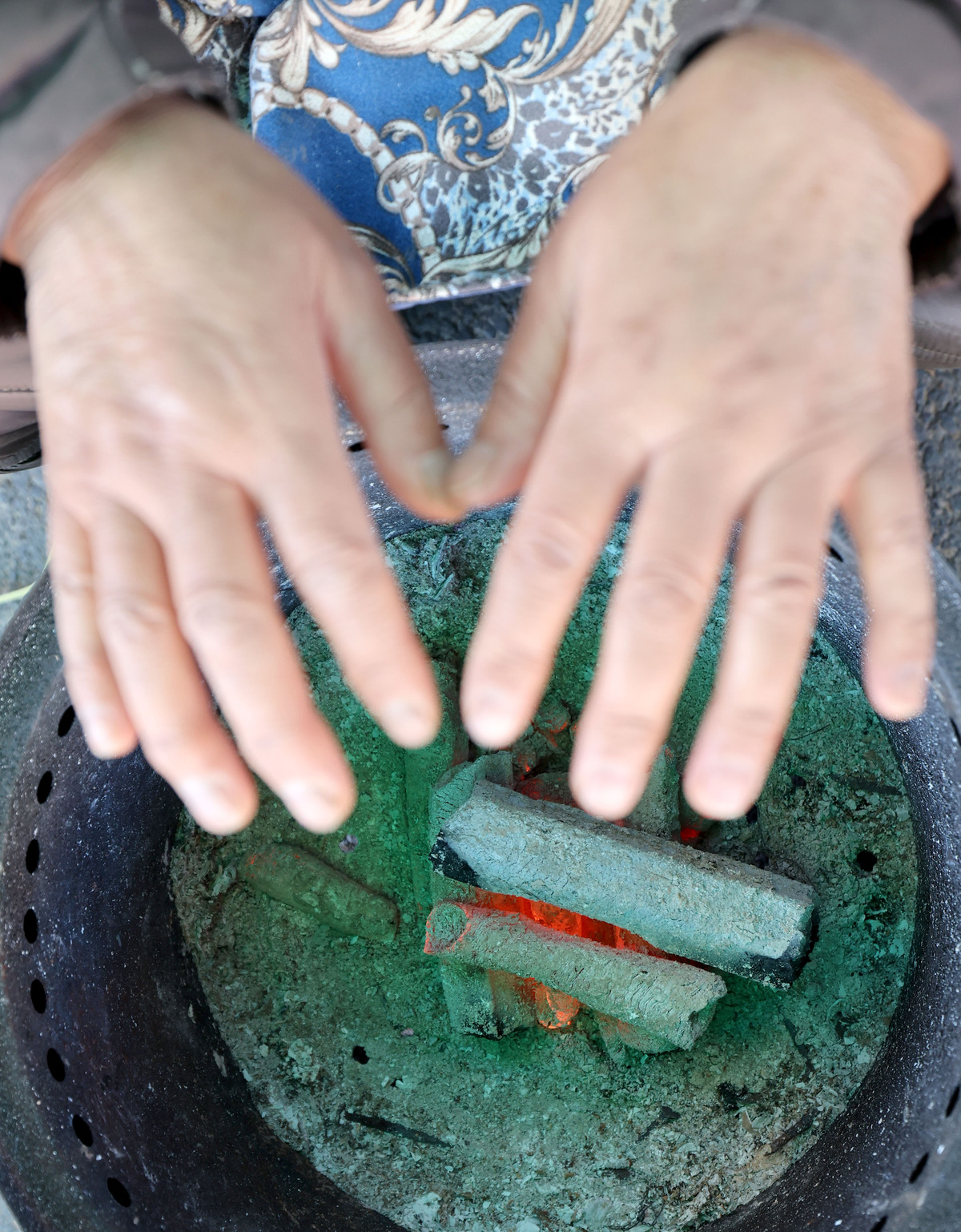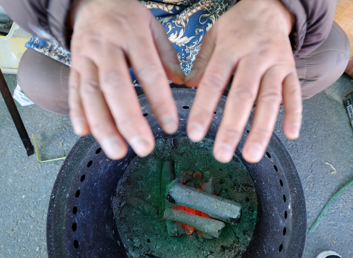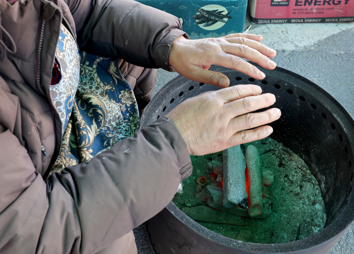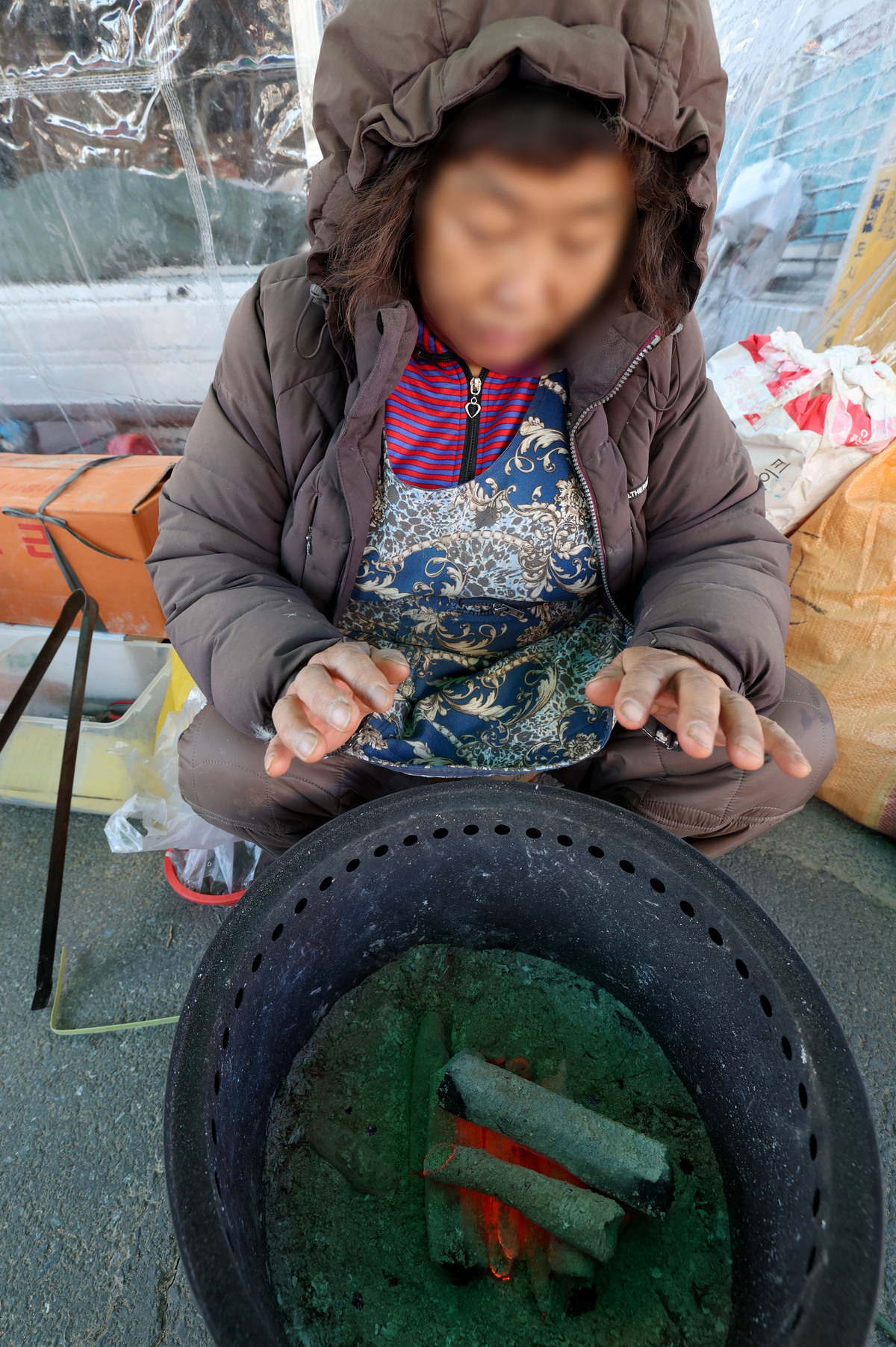 경주 지역 아침 최저 기온이 영하 6.2℃를 기록하며 동장군이 기승을 부린 4일 오일장이 열린 안강읍 전통시장에서 한 상인이 숯불 화로에 꽁꽁 언 손을 녹이고 있다. /이용선기자 photokid@kbmaeil.com