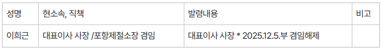 5일 포스코그룹은 2026년 정기 임원인사 발령에서 이희근 대표이사 사장이 겸임하고 있던 포항제철소장직은 이날로 겸임 해제하고, 같은 날 현 포항제철소 공정품질담당 박남식 부소장을 제철소장으로 발령했다. 신임 박 소장은 오는 16일자로 직급승진이 이뤄진다.