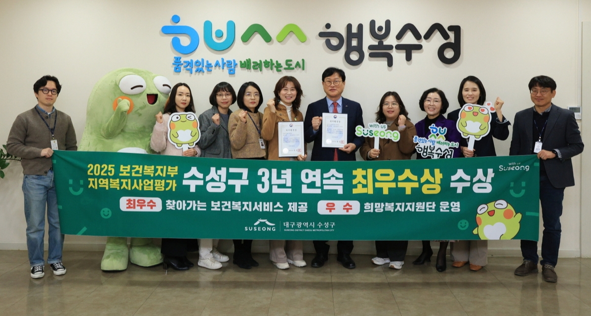 수성구는 ‘찾아가는 보건복지서비스 제공’ 부문에서 2023년부터 3년 연속 최우수상을 받았고, ‘희망복지지원단 운영’ 부문에서도 지난해에 이어 우수상을 수상했다.