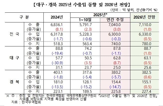 한국무역협회 대구경북지역본부가 8일 발표한 ‘2025년 대구·경북 수출입 평가 및 2026년 전망’에 따르면 올해 대구 수출은 1.1%, 경북은 5.7% 감소가 예상되지만 내년에는 각각 1.0%, 0.6% 증가하며 소폭의 회복세를 보일 것으로 관측됐다.