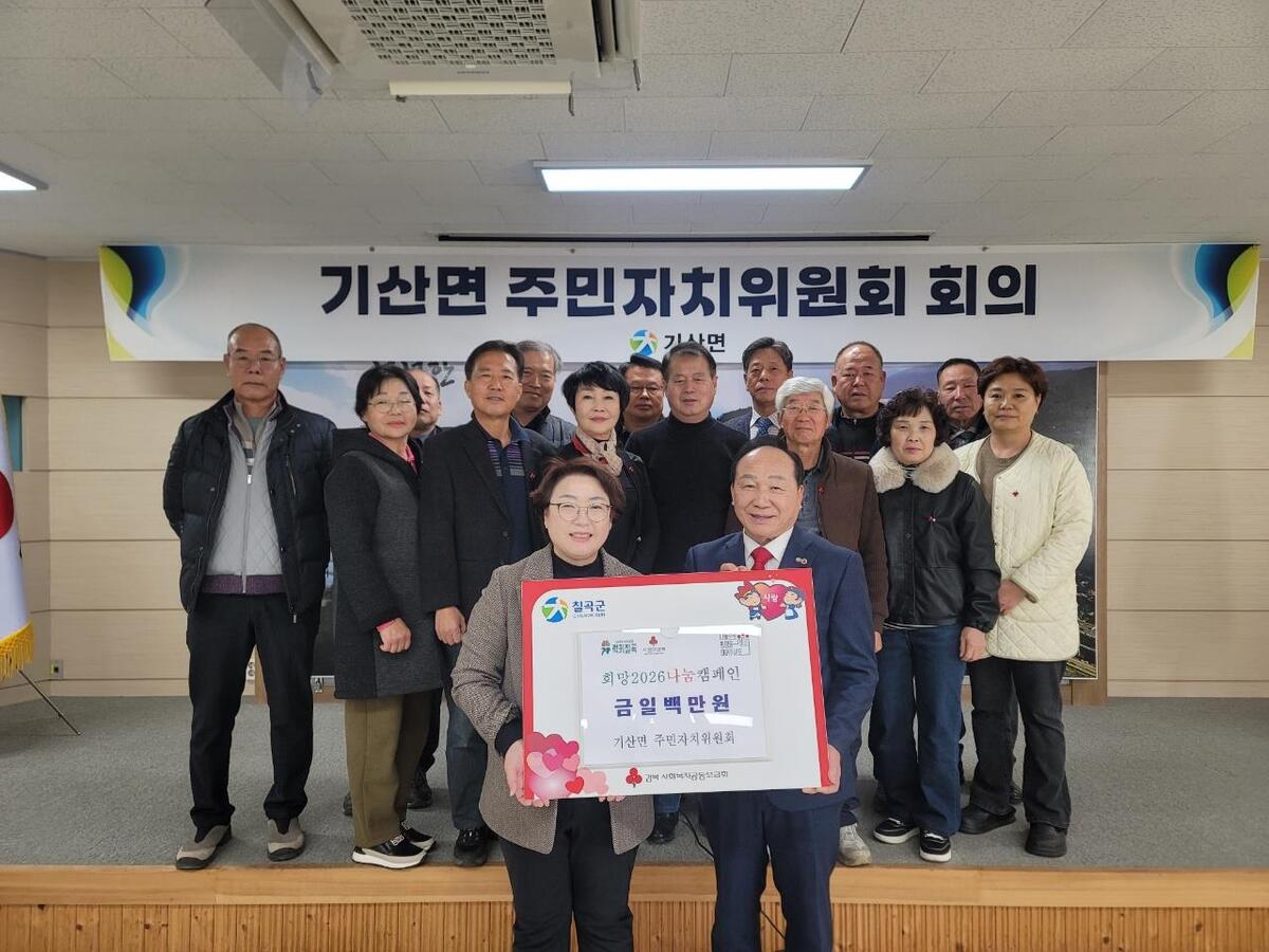 칠곡군 기산면(면장 김정인)은 최근, 기산면 주민자치위원회가 ‘희망2026 나눔캠페인’에 동참하며 성금 100만 원을 기탁했다고 밝혔다.