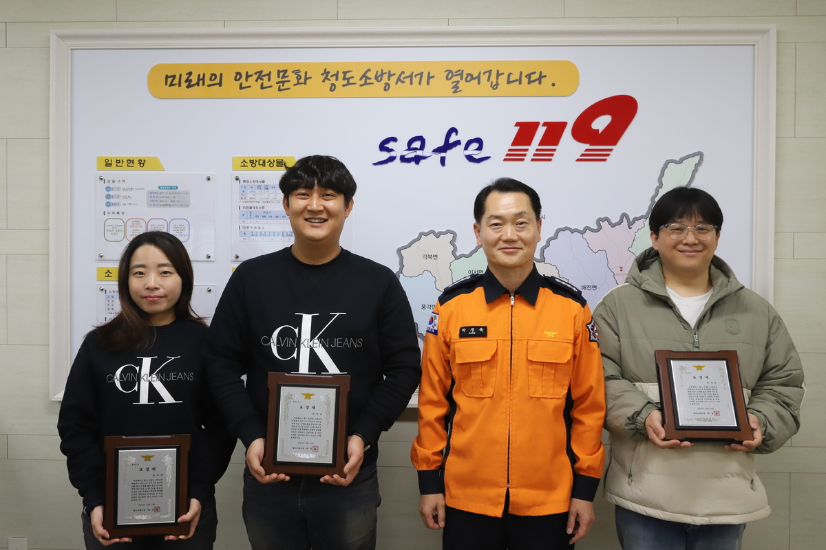 청도소방서가 15일 신속한 초기대응으로 큰 피해를 막은 유시연·이동민·정성민 씨를 표창했다.