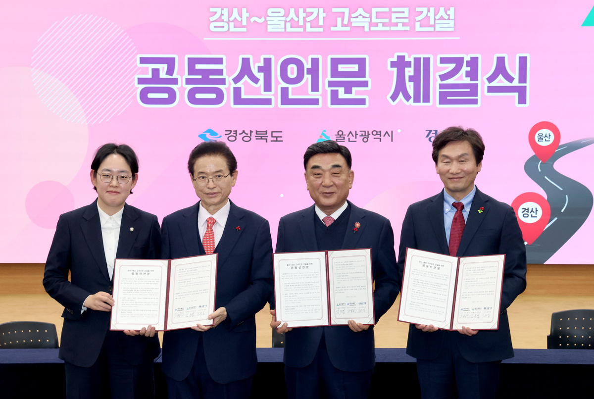 경산~울산 고속도로 신설 공동선언문 체결식이 16일 오후 경산시청 대회의실에서 열렸다. 왼쪽부터 조지연 국회의원, 이철우 경북도지사, 김두겸 울산광역시장, 조현일 경산시장이 공동선언문 서명 후 기념 촬영을 하고 있다. 공동선언문에는 고속도로 건설 국가계획 반영 공동 대응과 영남권 상생발전 기여 등의 내용을 담고 있다. /이용선기자 photokid@kbmaeil.com