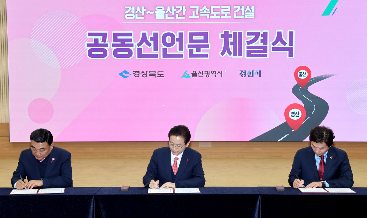 경산~울산 고속도로 신설 공동선언문 체결식이 16일 오후 경산시청 대회의실에서 열렸다. 왼쪽부터 김두겸 울산광역시장, 이철우 경북도지사, 조현일 경산시장이 공동선언문에 서명하고 있다. 공동선언문에는 고속도로 건설 국가계획 반영 공동 대응과 영남권 상생발전 기여 등의 내용을 담고 있다. /이용선기자 photokid@kbmaeil.com