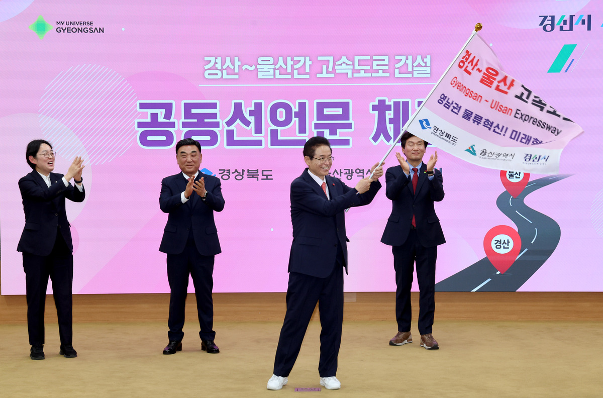 경산~울산 고속도로 신설 공동선언문 체결식이 16일 오후 경산시청 대회의실에서 열렸다. 왼쪽부터 조지연 국회의원, 김두겸 울산광역시장, 이철우 경북도지사, 조현일 경산시장이 공동선언문 서명 후 깃발 퍼포먼스를 하고 있다. 공동선언문에는 고속도로 건설 국가계획 반영 공동 대응과 영남권 상생발전 기여 등의 내용을 담고 있다. /이용선기자 photokid@kbmaeil.com