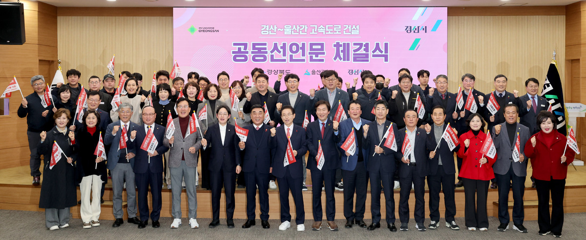 경산~울산 고속도로 신설 공동선언문 체결식이 16일 오후 경산시청 대회의실에서 열렸다. 이철우 경북도지사, 김두겸 울산광역시장, 조현일 경산시장, 조지연 국회의원을 비롯한 지자체 관계자들이 기념 촬영을 하고 있다. 공동선언문에는 고속도로 건설 국가계획 반영 공동 대응과 영남권 상생발전 기여 등의 내용을 담겨 있다. /이용선기자 photokid@kbmaeil.com