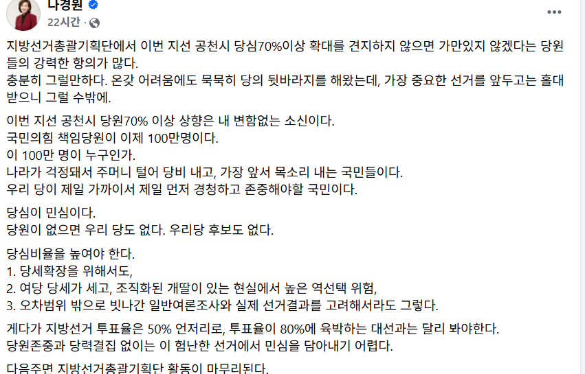 나 의원은 19일 페이스북을 통해 “이번 지선 공천시 당원 70% 이상 상향은 내 변함없는 소신”이라고 밝혔다.