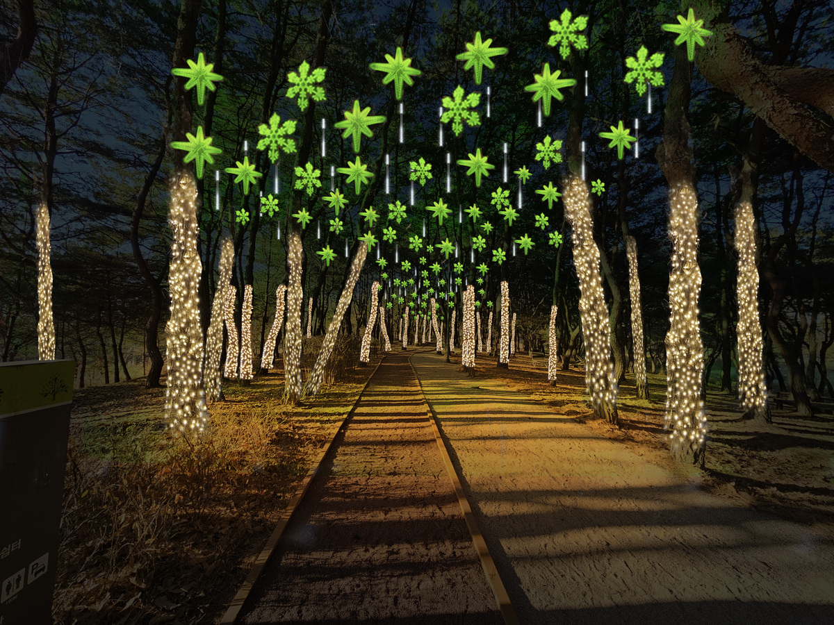 또 소나무숲 약 150m 구간에는 반딧불이가 깜빡이는 듯한 조명과 청색 계열의 빛이 어우러져 깊은 숲 속에 들어온 듯한 몽환적인 분위기를 자아낸다. 특히 따뜻하고 은은한 조명은 숲의 자연스러움과 어우러져 차분하면서도 아늑한 야간 산책로를 만들어낸다. 경관조명은 오는 24일부터 2026년 2월 28일까지 점등된다.