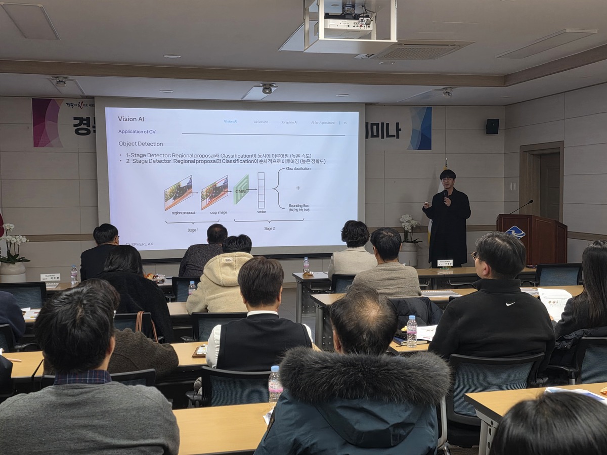 이어 ㈜스피어AX AI 개발본부는 ‘지능형 영상분석 기반 서비스’ 발표를 통해 산불탐지 기술, 지능형 영상분석 시스템, 농산물 수확용 로봇 인식 기술 등 이미지·영상 분석 인공지능(Vision AI)의 다양한 활용 사례를 선보이며, AI가 농업 현장에서 생산성 향상뿐 아니라 안전 관리에도 기여할 수 있음을 보여줬다.