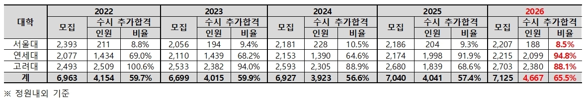 2026학년도 서울대·연세대·고려대(서연고) 수시모집에서 총 4667명의 추가합격자가 발생한 것으로 집계됐다. 이는 수시 모집인원 대비 65.5%로 최근 5년 새 가장 큰 규모다. 대학별로는 서울대 188명, 연세대 2099명, 고려대 2380명이다.
