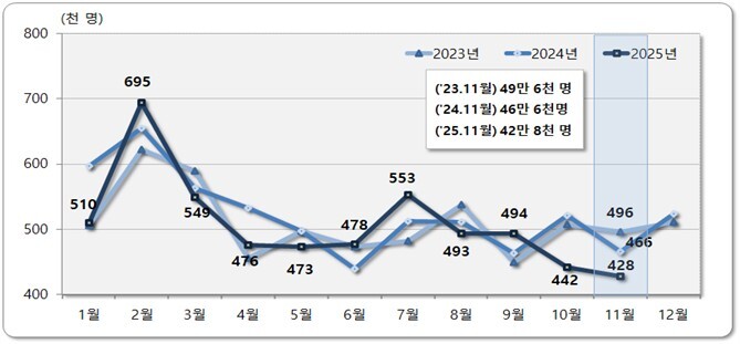 전국적으로 보면 11월 총 이동자 수는 42만 8000명으로 전년 동월 대비 8.2% 감소했다. 인구 100명당 이동자 수를 뜻하는 인구이동률 또한 10.2%로 0.9%p 하락했다.