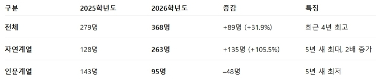2026학년도 서울대·연세대·고려대(서연고) 수시모집에서 전체 미충원 인원 368명이 발생한 것으로 집계됐다. 지난해 279명 보다 89명(31.9%) 증가한 수치로 최근 4년 새 가장 높은 수준이다. 자연계는 미충원이 두 배 이상 늘어난 반면 인문계는 오히려 최근 5년 중 최저치를 기록해 계열 간 격차가 크게 벌어졌다.