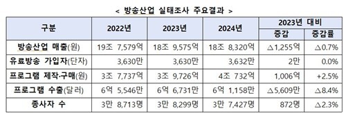 방송미디어통신위원회가 31일 발표한 ‘2024년 국내 방송산업 실태조사‘ 결과에 따르면 지난해 방송 매출액은 2023년보다 0.7% 감소한 18조8320억원.