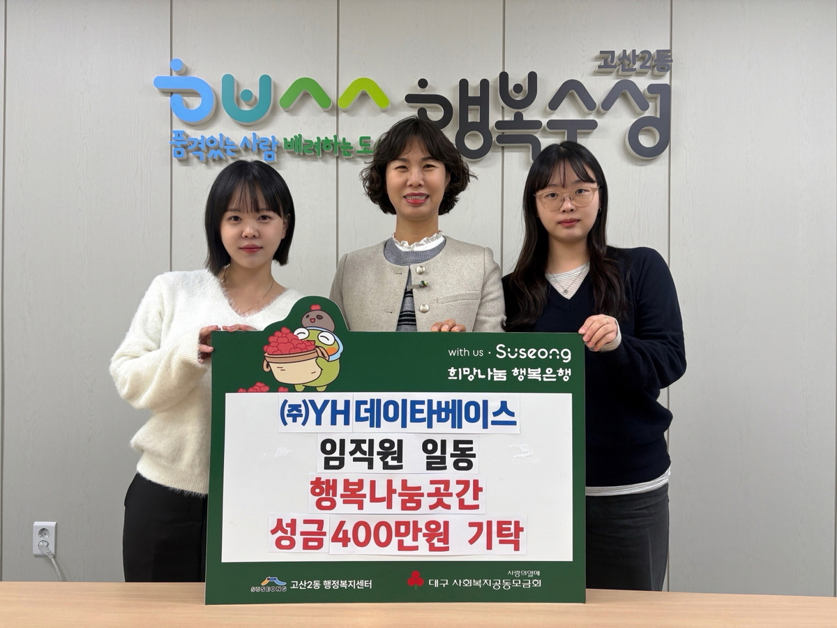 ㈜YH데이타베이스(대표 최대룡) 임직원들이 연말 바자회를 통해 모은 수익금 400만 원을 대구 수성구 고산2동행정복지센터에 기탁하며 지역사회 나눔 활동을 이어갔다.