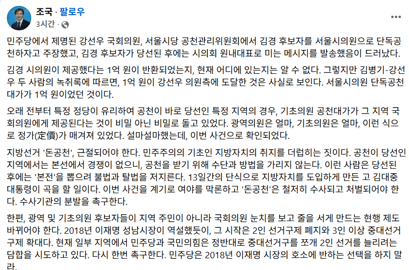 조 대표는 3일 자신의 페이스북에 “‘돈 공천’은 13일간의 단식으로 지방자치를 도입하게 만든 고(故) 김대중 대통령이 곡을 할 일”이라면서 “여야를 막론하고 ‘돈 공천’은 철저히 수사되고 처벌되어야 한다. 수사기관의 분발을 촉구한다”고 주장했다.