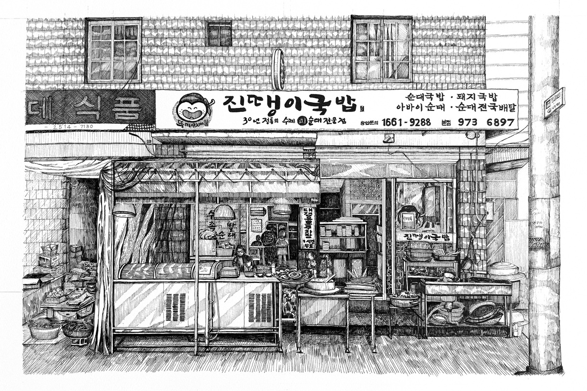 전시에는 칠곡의 골목과 가게, 시장 등을 담은 30여 점의 펜화 작품이 전시됐다. 주제는 유명 관광지가 아닌, 주민들이 일상적으로 드나드는 공간이었다.
