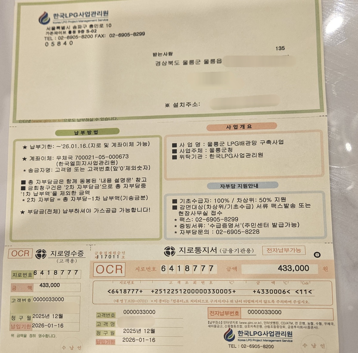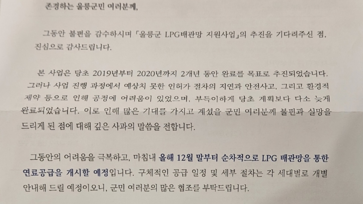 지난해 12월 ‘가스공급 개시 안내문’과 함께 ‘자부담금 납부 고지서’를 지역 내 1380세대에 발송한 울릉군과 한국LPG사업관리원은 안내문을 통해 “2020년까지 사업을 완료할 예정이었으나 인허가 절차 지연과 안전사고 등으로 늦어졌다”고 적시하고 구체적 공급일정은각 세대별로 안내할 것이라고 공지했다. 그러면서 부담분 미납시 가스공급이 어렵다고 명시했다.