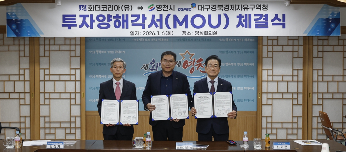 대구경북경제자유구역청(DGFEZ)은 6일 영천시청에서 강상기 대경경자청장 직무대행, 최기문 영천시장, 왕밍 화더코리아(유) 대표이사 등이 참석한 가운데 화더코리아(유)의 자동차 부품 사업 추진을 위한 투자양해각서(MOU)를 체결했다고 밝혔다.