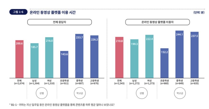 시청시간은 하루 평균 200.6분, 약 3.3시간이었다. 중학생이 233.7분으로 가장 많고 고등학생 226.2분, 초등학생이 143.6분이었다.