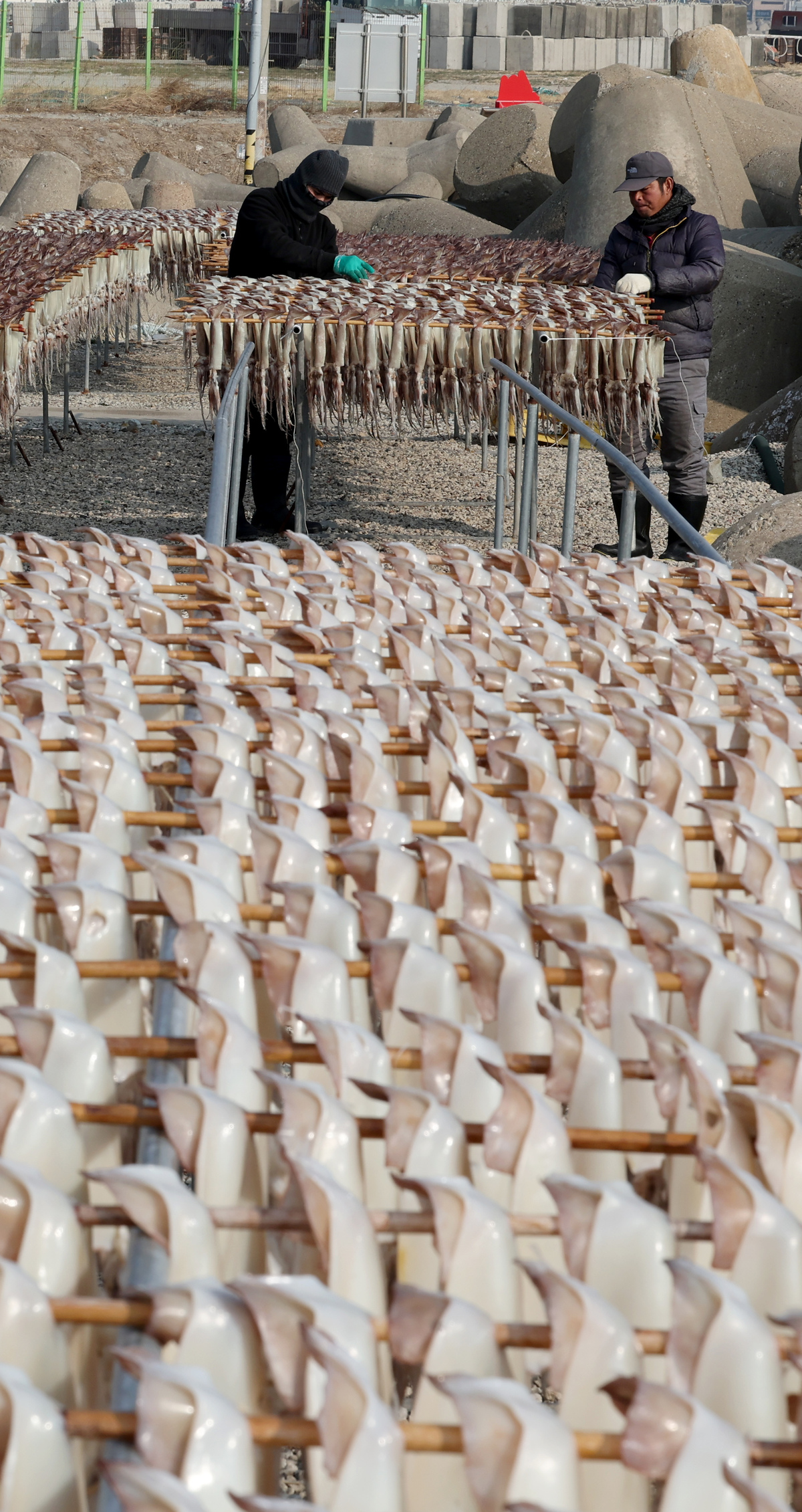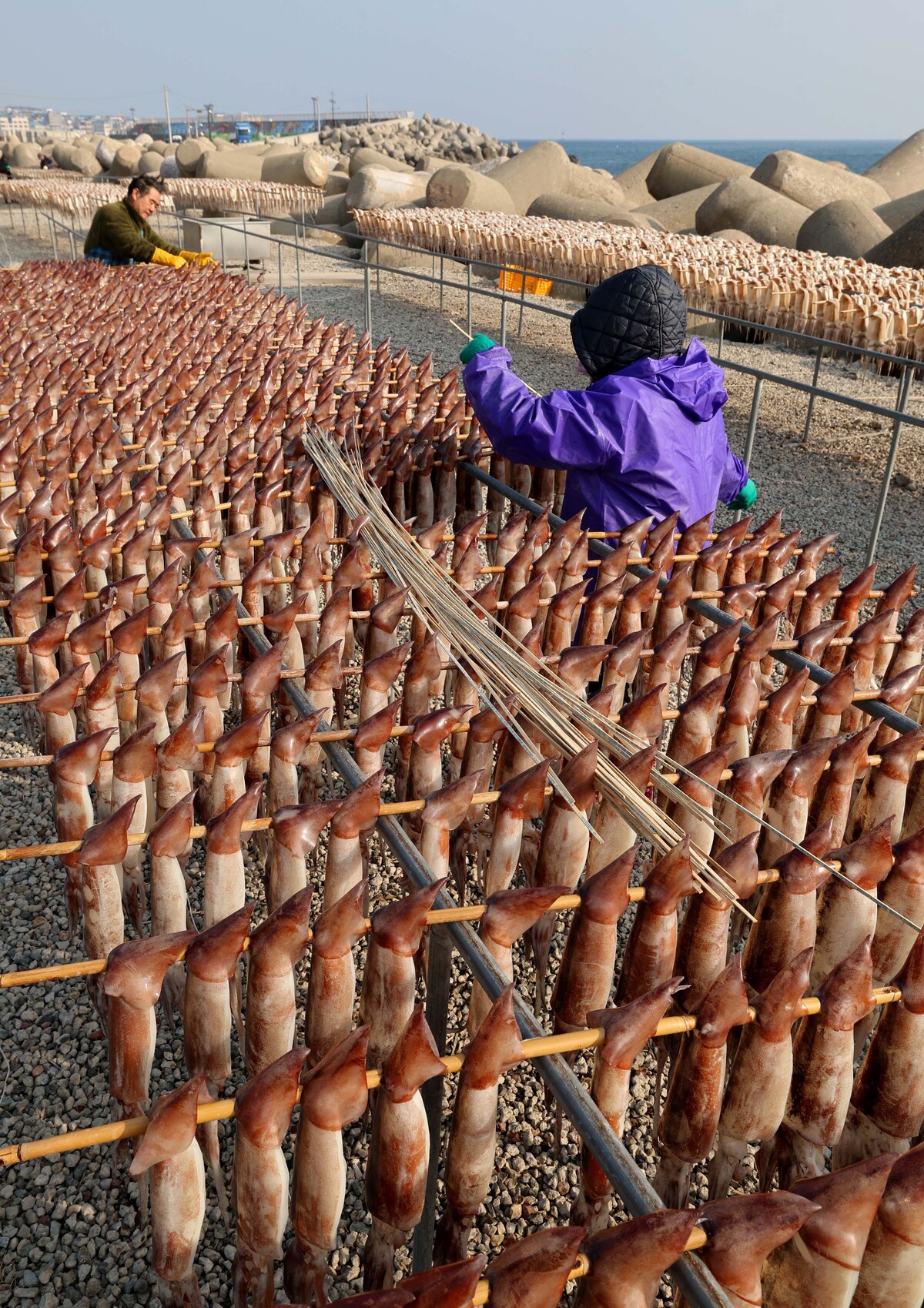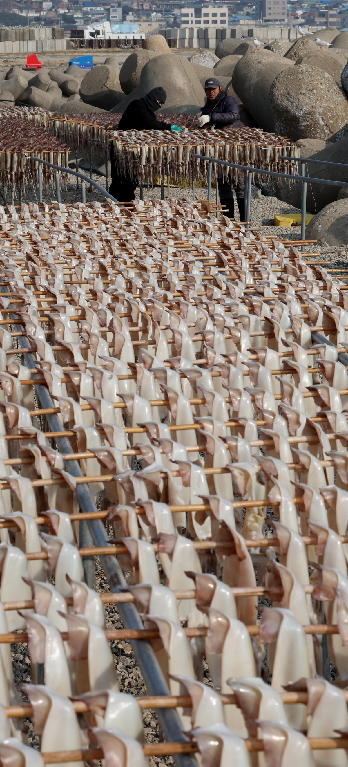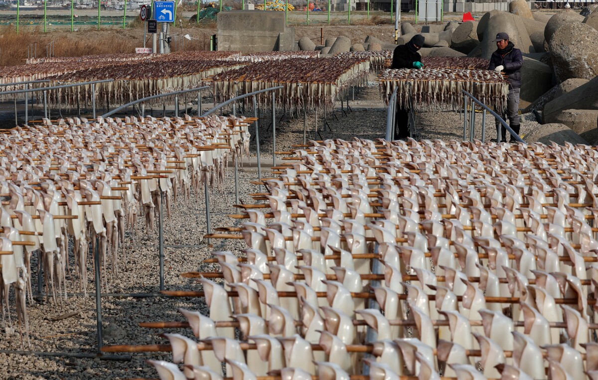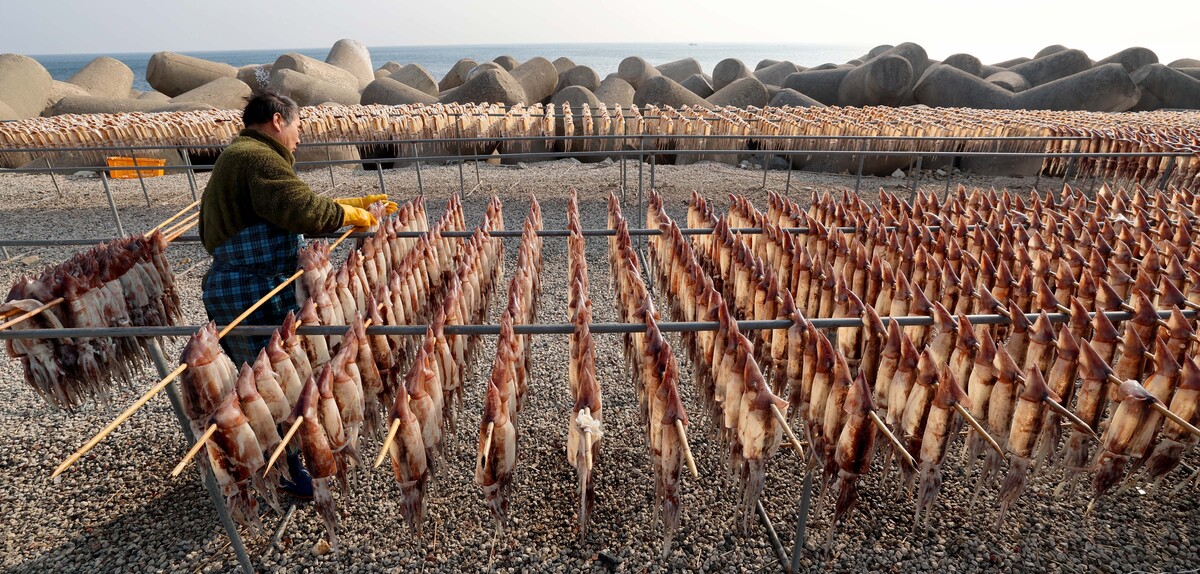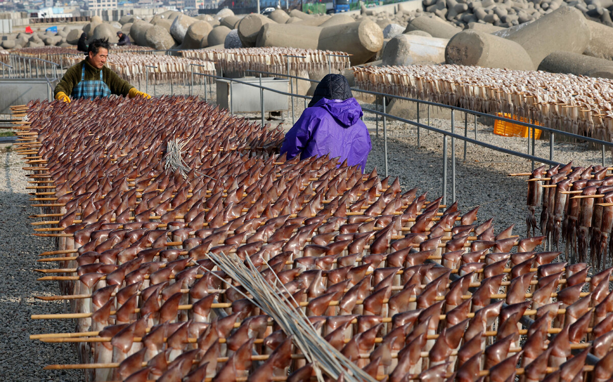 7일 오후 포항시 남구 구룡포읍 해변에서 어민이 연근해에서 잡힌 오징어 건조 작업을 하고 있다. “구룡포 앞바다에서 오랜만에 오징어가 잡혀서 작업하고 있다.”라며 “생물이라서 일주일 정도 건조한 후 전량 대형마트로 납품한다.”라고 전했다. /이용선기자 photokid@kbmaeil.com