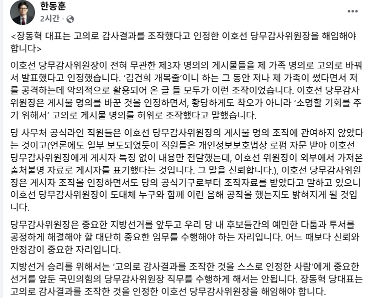 한동훈 전 국민의힘 대표가 ‘감사결과를 조작했다고 인정’한 이호선 당무감사위원장을 해임하라고 촉구했다.