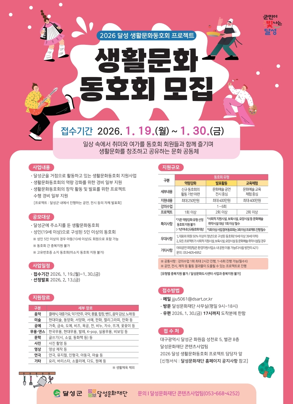 대구 달성군이 주민 주도의 생활문화 확산을 위해 생활문화동호회 지원에 나선다. (재)달성문화재단은 오는 19일부터 30일까지 ‘2026 달성 생활문화동호회 프로젝트’에 참여할 동호회를 모집한다고 9일 밝혔다.