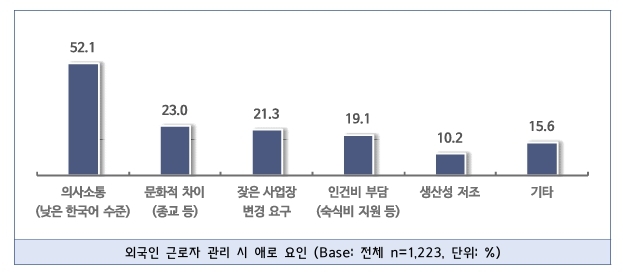 채용 시 고려 사항으로는 출신 국가(59.4%)와 한국어 능력(56.3%)이 비슷한 비중을 차지했다. 실제로 외국인 근로자 관리 과정에서 가장 큰 애로사항으로 ‘낮은 한국어 능력에 따른 의사소통 문제’를 꼽은 응답이 52.1%로 가장 많았다.