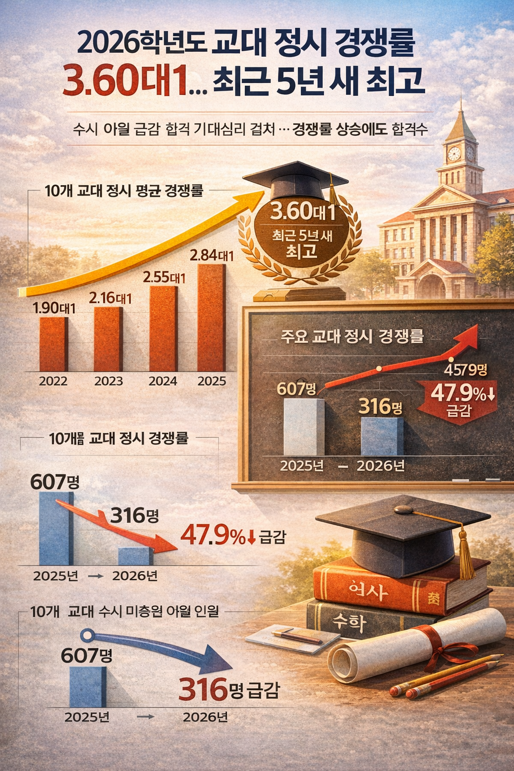 2026학년도 대학 정시모집에서 전국 10개 교육대학의 평균 경쟁률이 3.60대 1을 기록하며 최근 5년 새 최고치를 나타냈다. 서울교대를 포함한 10개 교대 모두 전년 대비 경쟁률이 상승해 교대 정시 지원 열기가 다시 살아나는 모습이다.