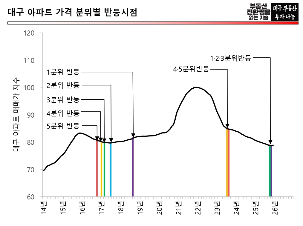그는 “도심과 상급지가 먼저 움직이고 외곽 구축이 뒤따르는 흐름은 대구 시장에서 반복돼 온 전형적인 반응 순서”라며 “외곽이 외면받고 있는 것이 아니라 아직 순서가 오지 않았을 뿐”이라고 말했다. 특히 “최근 외곽 구축 아파트에서도 거래량 바닥 통과, 가격 하락폭 축소, 급매 소진 이후 호가 회복 시도 등 후행 자산의 초기 반등 신호가 나타나고 있다”고 덧붙였다.