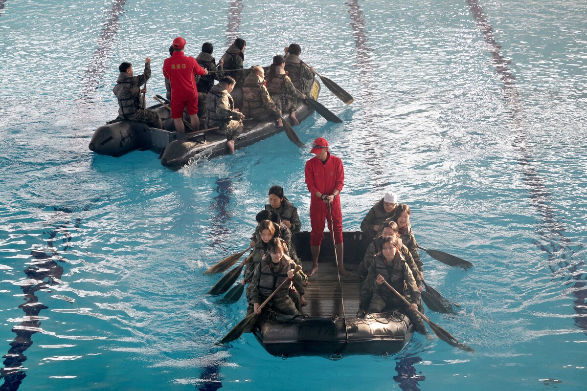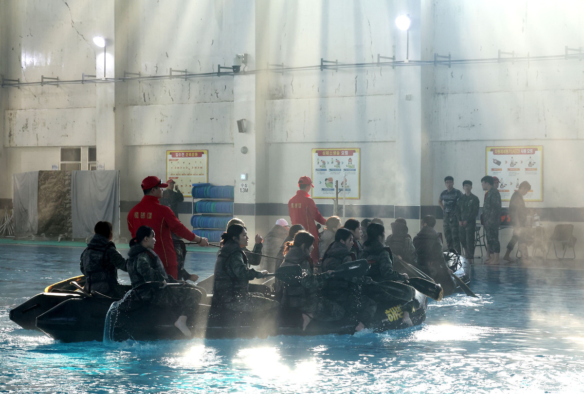 13일 오전 포항 해병대 1사단에서 열린 ‘2026년 겨울 해병대 캠프’ 참가자들이 인천상륙관에서 IBS(소형고무보트) 체험을 하고 있다. /이용선기자 photokid@kbmaeil.com