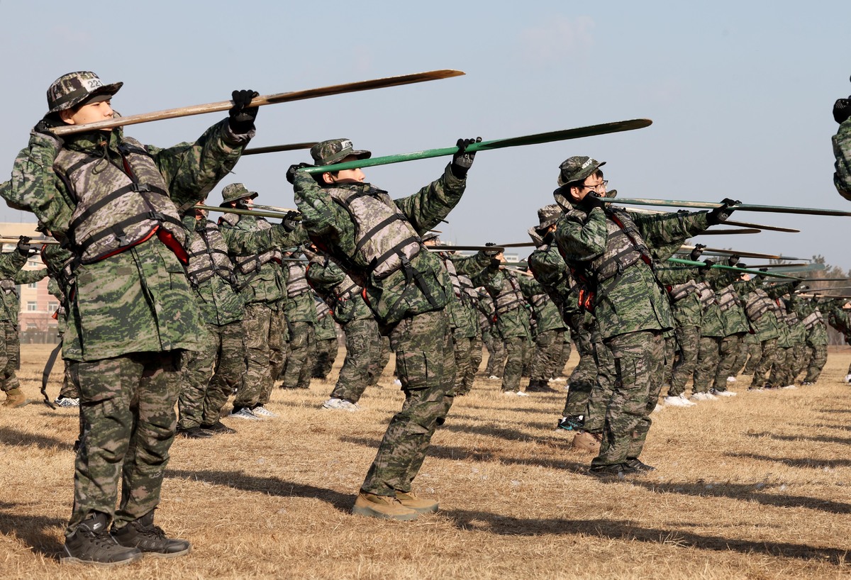 13일 오전 포항 해병대 1사단 연병장에서 열린 ‘2026 겨울 해병대 캠프’에서 참가자들이 IBS(소형 고무보트) 육상페달링 연습을 하고 있다. /이용선기자 photokid@kbmaeil.com