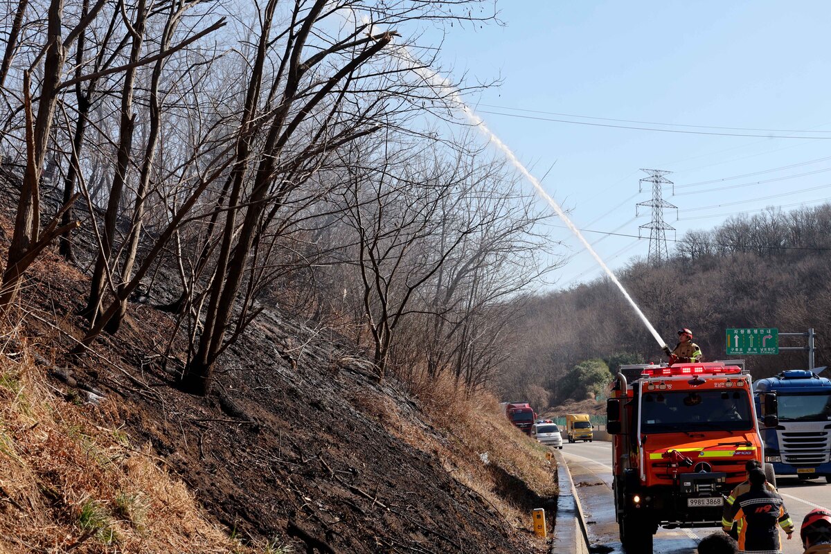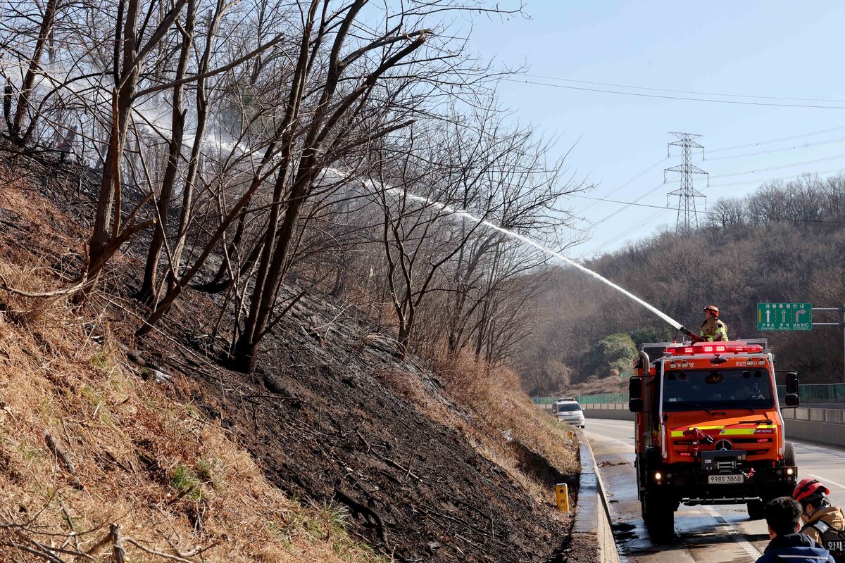 13일 오전 11시 31분께 포항시 남구 대송면 대각리 영일만 대로변 비탈면에서 원인을 알 수 없는 불이나 출동한 소방대원이 진화작업을 하고 있다. /이용선기자 photokid@kbmaeil.com