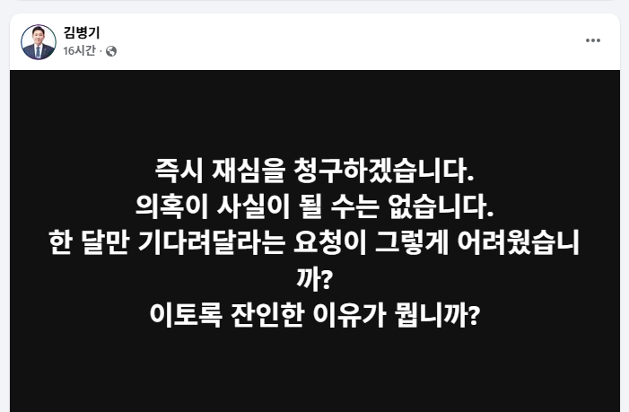 전날 밤 윤리심판원의 제명 결정 직후 김 의원은 자신의 페이스북을 통해 “즉시 재심을 청구하겠다. 의혹이 사실이 될 수는 없다”며 징계 수용 의사가 없음을 밝혔다.