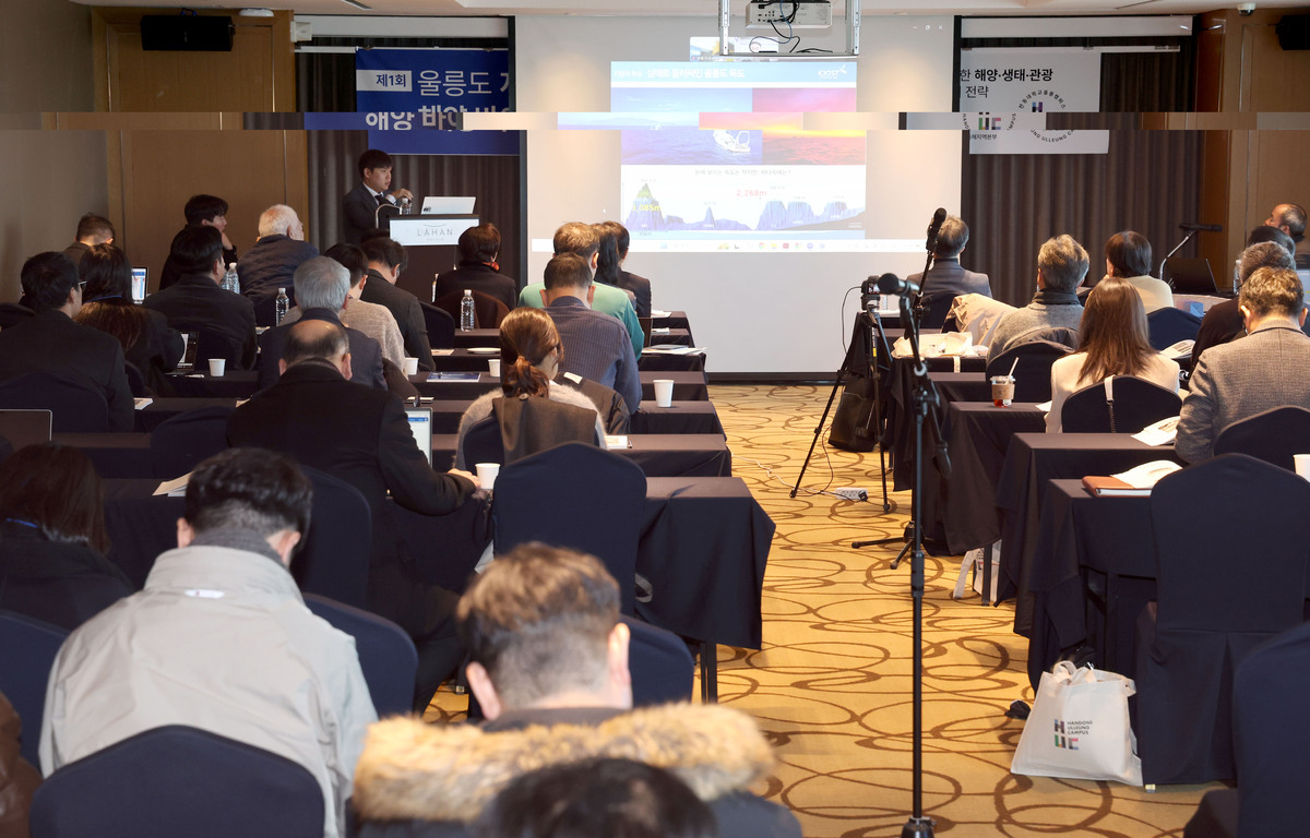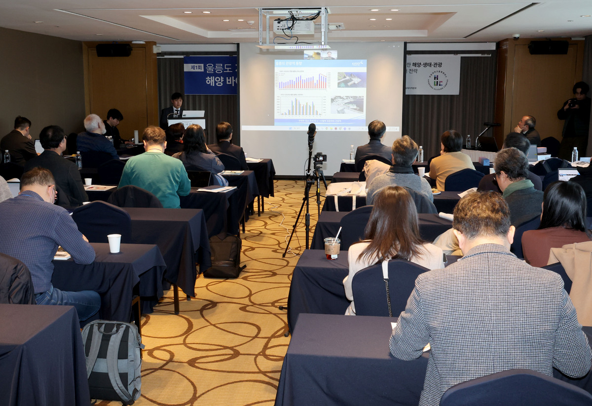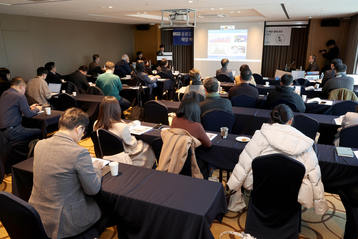 제1회 울릉도 지속 가능 미래 전략 및 해양 바이오 혁신 심포지엄이 14일 포항 라한 호텔에서 열렸다. 울릉도·독도 해양 연구기지 김윤배 대장이 ‘기후 위기 시대, 울릉도의 해양 생태 관광 현안과 지속 가능한 섬을 위한 대응 방향’에 대해 발표하고 있다. /이용선기자 photokid@kbameil.com