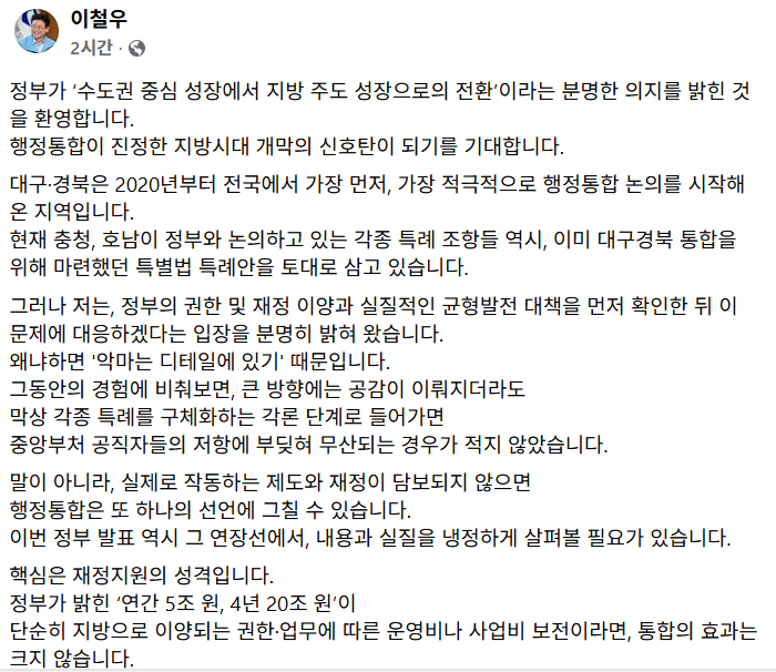 이 도지사는 16일 자신의 페이스북에 “정부가 ‘수도권 중심 성장에서 지방 주도 성장으로의 전환‘이라는 분명한 의지를 밝힌 것을 환영한다“며 “행정통합이 진정한 지방시대 개막의 신호탄이 되기를 기대한다“고 했다.