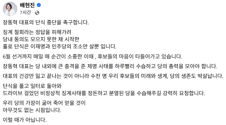 배현진 의원은 이날 페이스북에 “장 대표의 단식 중단을 촉구한다“며 “징계 철회라는 정답을 피해 가려 당내 동의도 모으지 못한 채 시작한 홀로 단식은 이재명과 민주당의 조소만 살 뿐“이라고 말했다.